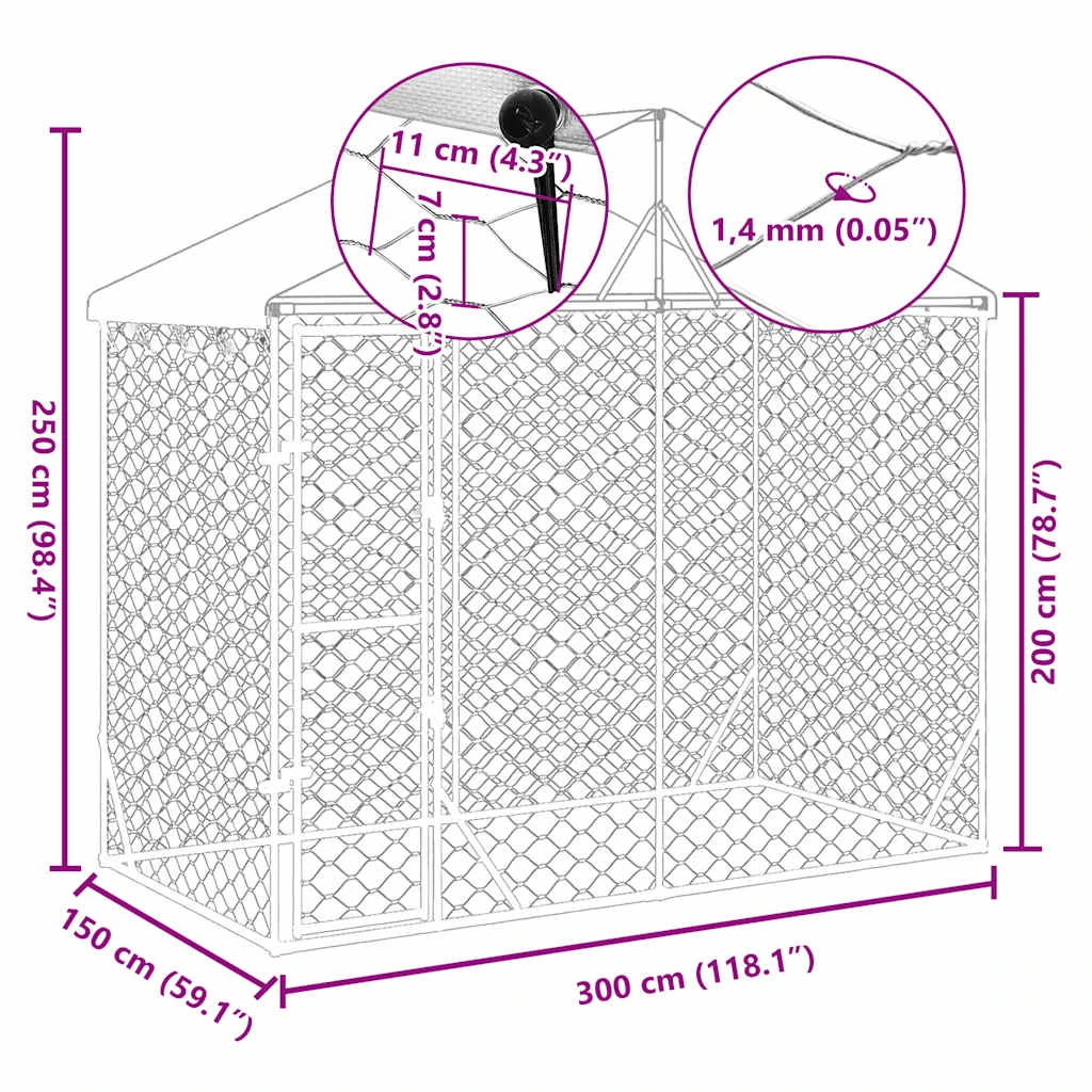 vidaXL suņu voljērs ar jumtu, sudrabains, 3x1,5x2,5 m, cinkots tērauds