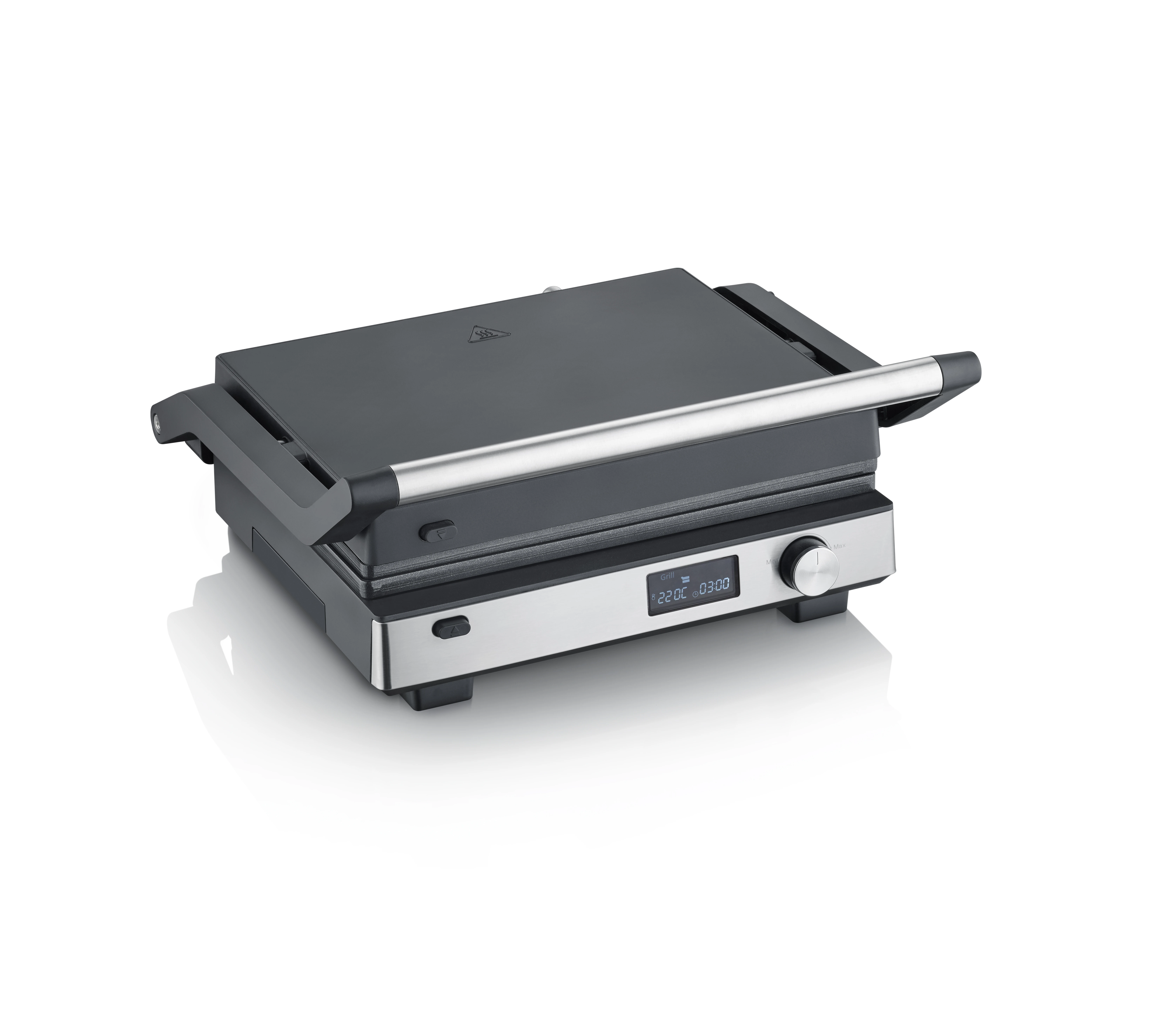 Daudzpusīgs daudzkontaktu grils. Trīs maināmas plāksnes gaļas, burgeru, panini, sviestmaižu un pat Beļģijas vafeļu cepšanai