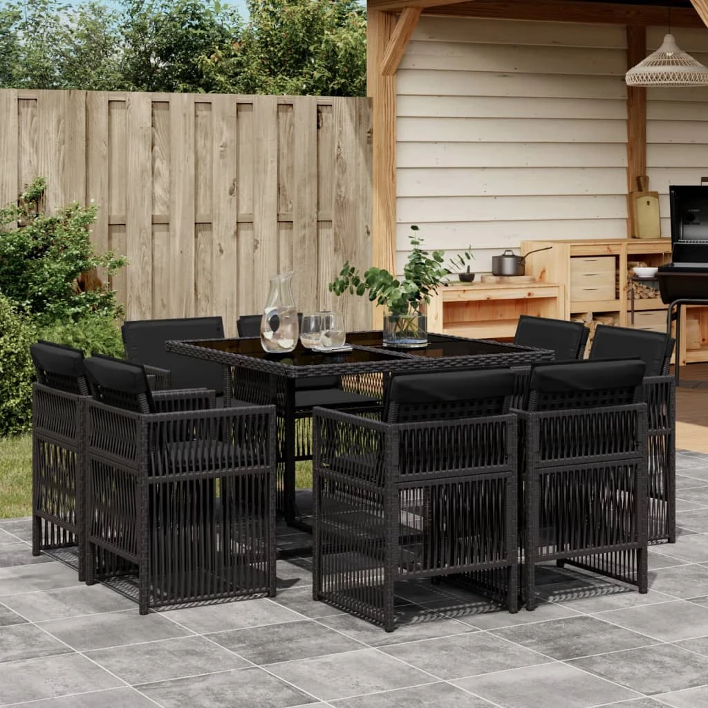 vidaXL 9-daļīgs dārza mēbeļu komplekts, matrači, melns, PE rotangpalma