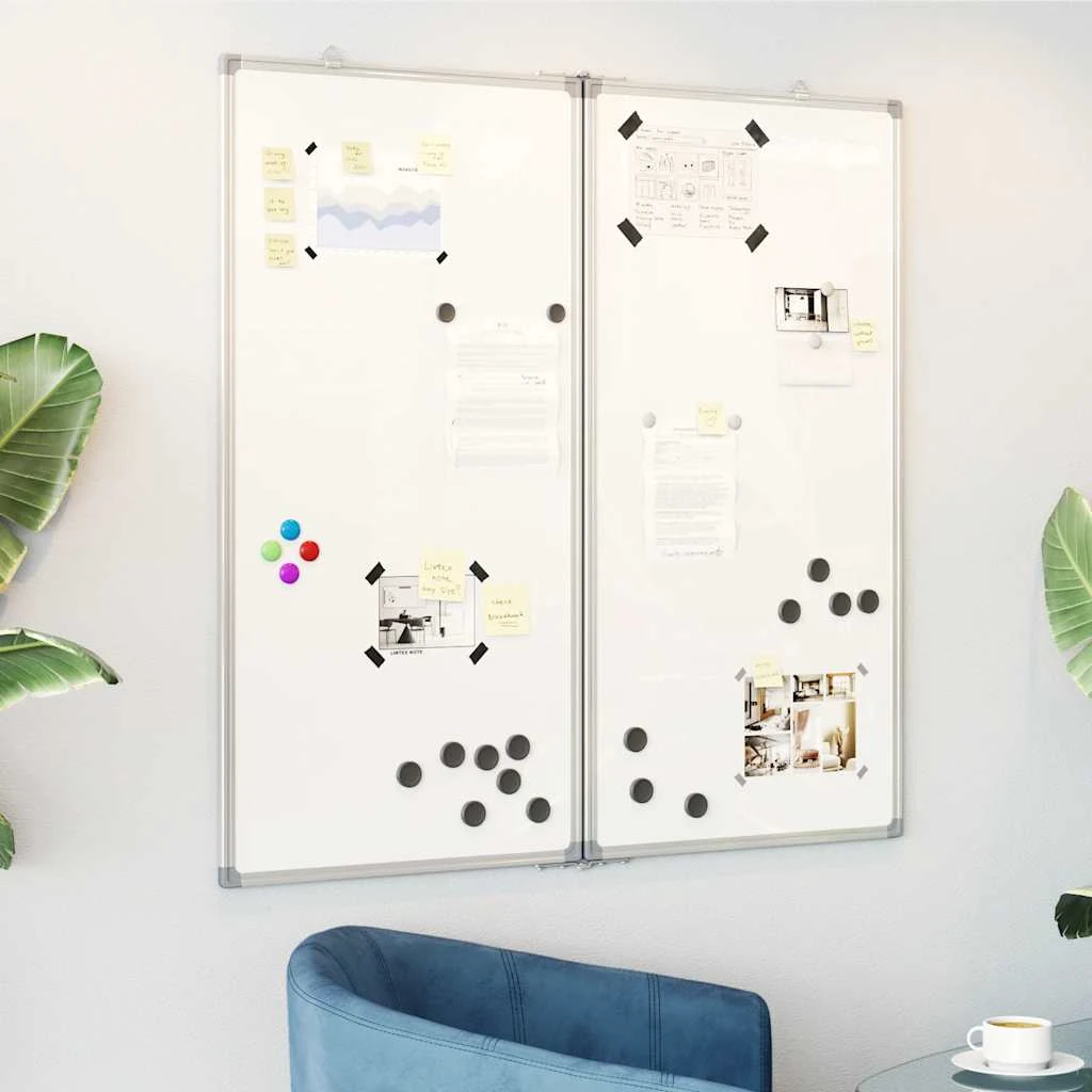 - Salokāma: magnētiskā tāfele sastāv no diviem paneļiem ar eņģēm, kas nodrošina vairāk vietas rakstīšanai, un to var noliekt un salocīt atbilstoši jūsu vajadzībām.