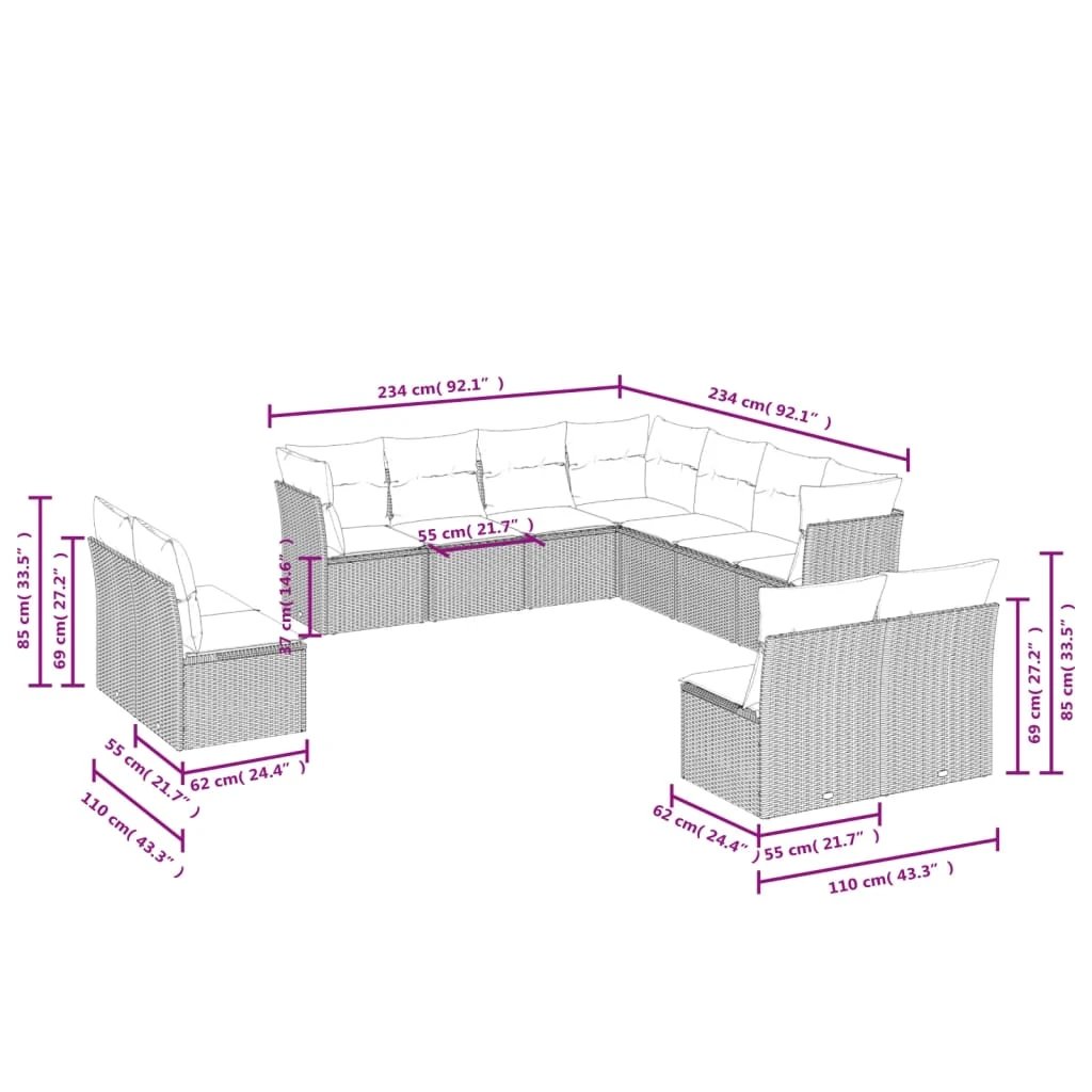 - 7-vietīga dīvāna kopējais izmērs: 234 x 234 x 69 cm (platums, dziļums, augstums)