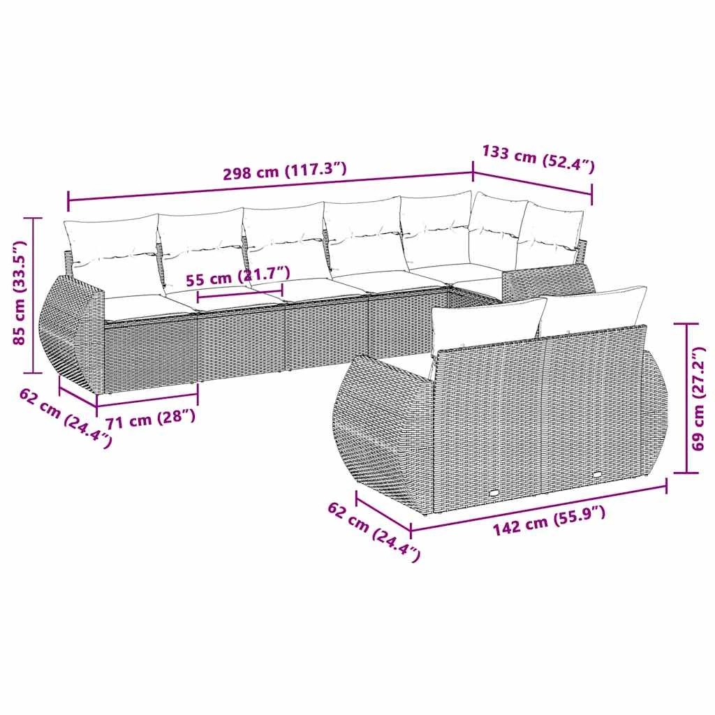 vidaXL 8-daļīgs dārza dīvāna komplekts,matrači, gaiši pelēka PE pinums