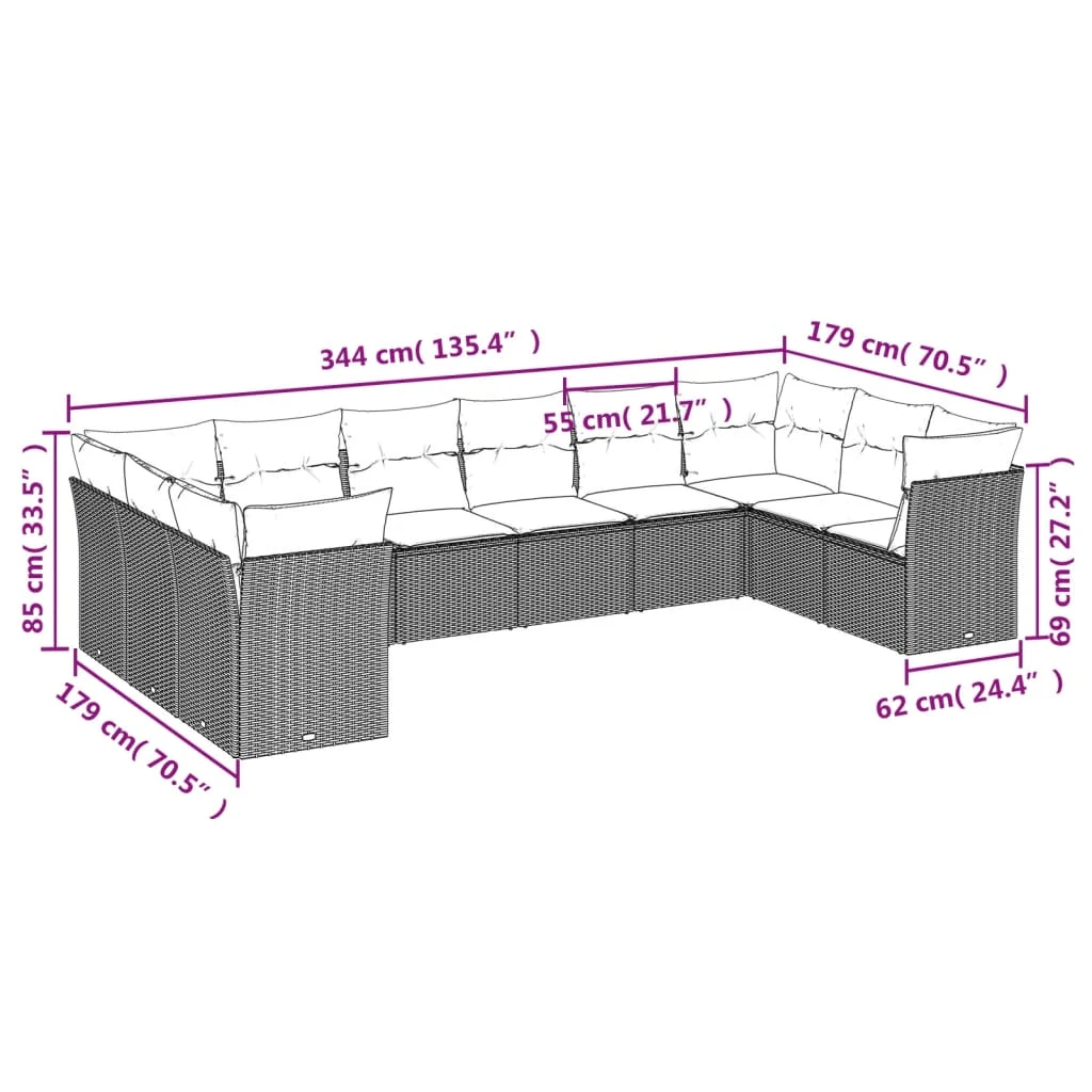 vidaXL 10-daļīgs dārza dīvāna komplekts, matrači, bēša PE rotangpalma