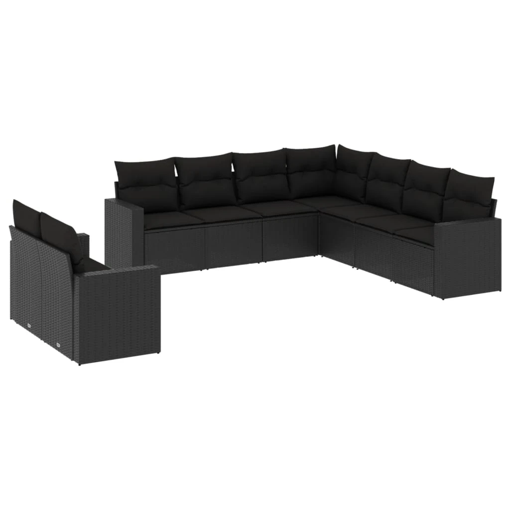 vidaXL 9-daļīgs dārza dīvāna komplekts, matrači, melna PE rotangpalma