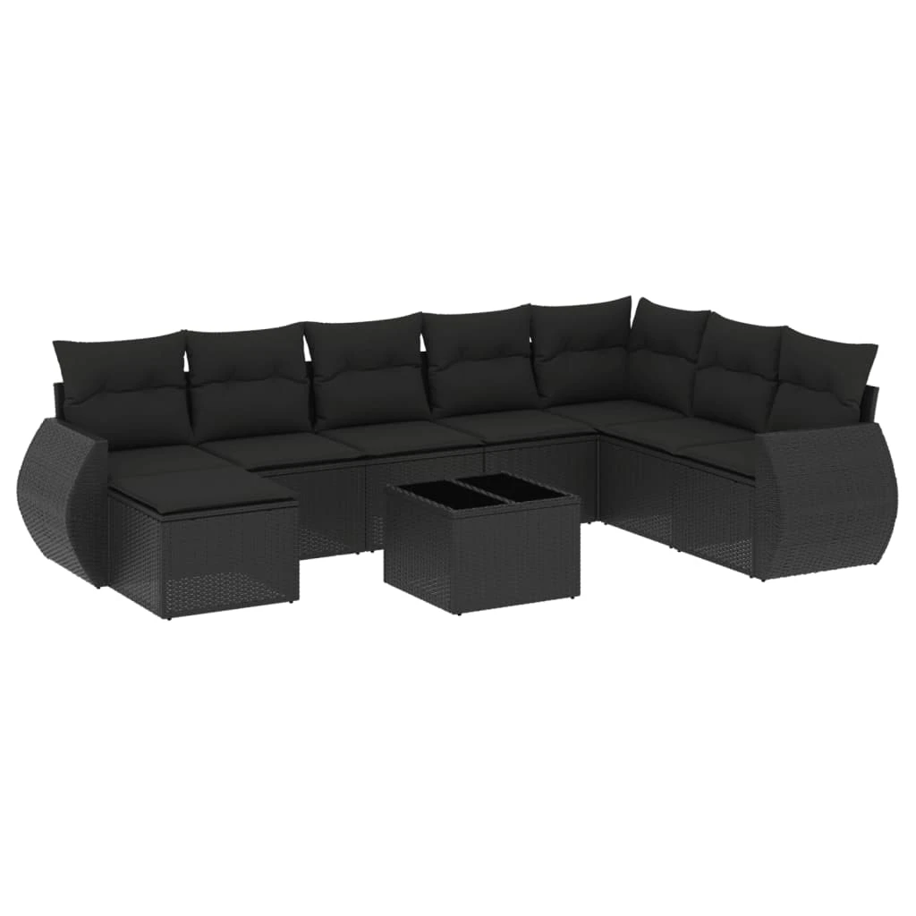 vidaXL 9-daļīgs dārza dīvāna komplekts, matrači, melna PE rotangpalma