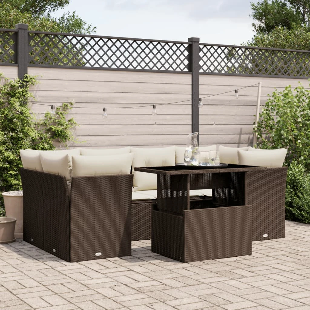 vidaXL 7-daļīgs dārza dīvānu komplekts, matrači, brūna PE rotangpalma