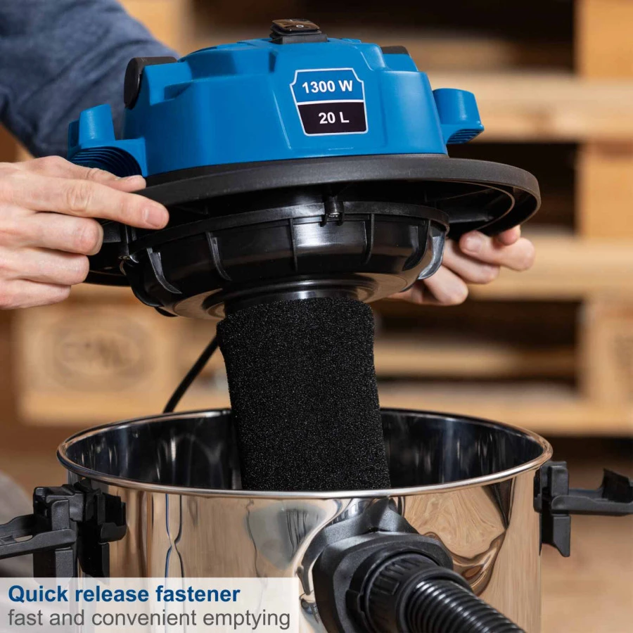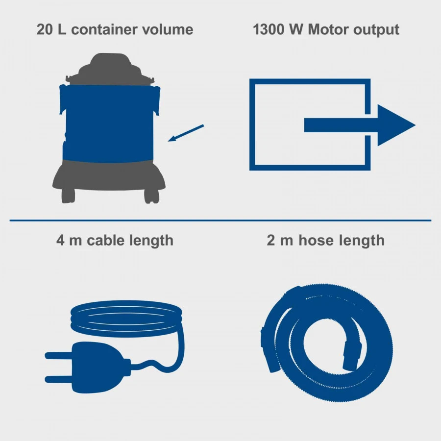 Scheppach elektriskais mitrās/sausās tīrīšanas putekļsūcējs VC20, 20 kPa, 20 L savākšanas tvertne, 1300 W, 220–240 V~ / 50 / 60 Hz, 3-in-1 funkcija