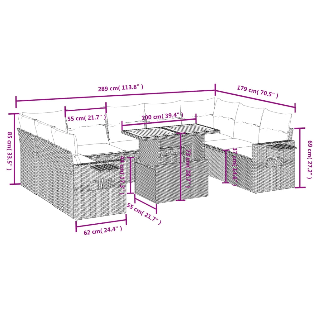 vidaXL 10-daļīgs dārza dīvāna komplekts, matrači, melna PE rotangpalma