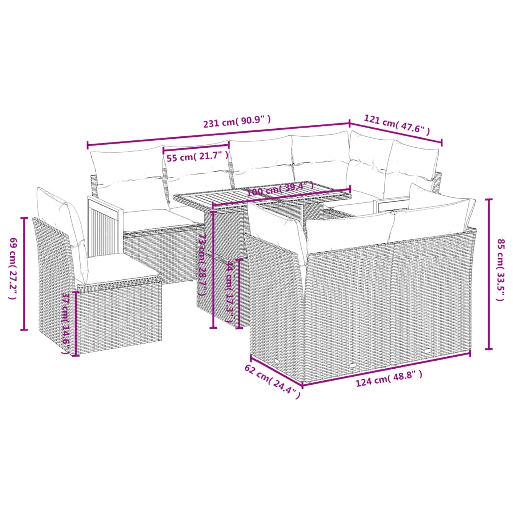 vidaXL 9-daļīgs dārza dīvāna komplekts ar matračiem, pelēks PE pinums
