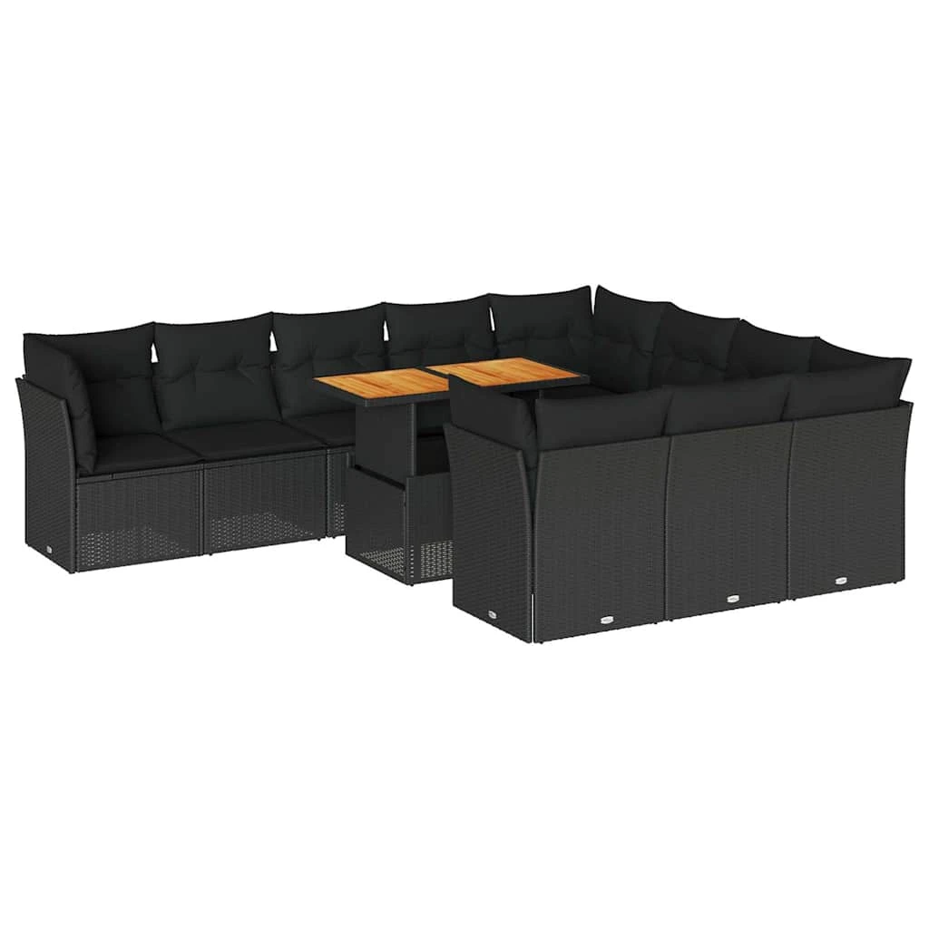 vidaXL 11-daļīgs dārza dīvāna komplekts, matrači, melna PE rotangpalma