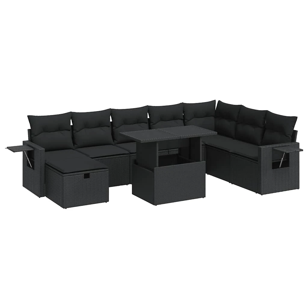 vidaXL 9-daļīgs dārza dīvāna komplekts, matrači, melna PE rotangpalma