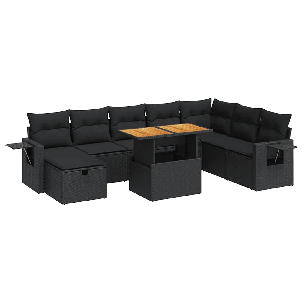 vidaXL 9-daļīgs dārza dīvāna komplekts, matrači, melna PE rotangpalma