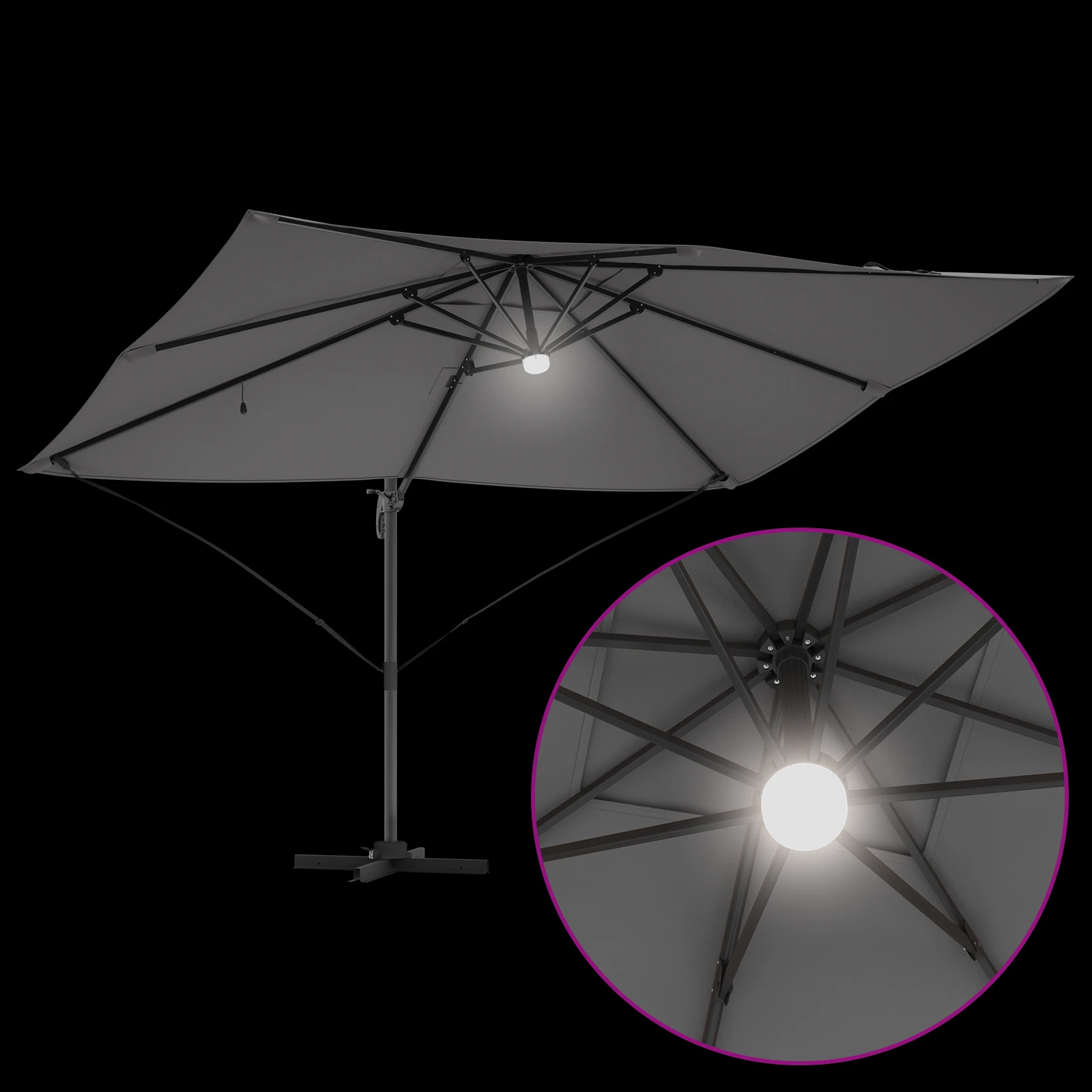 - Funkcionāls apgaismojums: Aprīkots ar LED gaismas lentēm, šis lietussargs piedāvā mājīgu atmosfēru vakaros. Ķēde darbojas uz saules enerģijas, ļaujot ilgstoši izbaudīt patīkamības sajūtu pēc saulrieta.