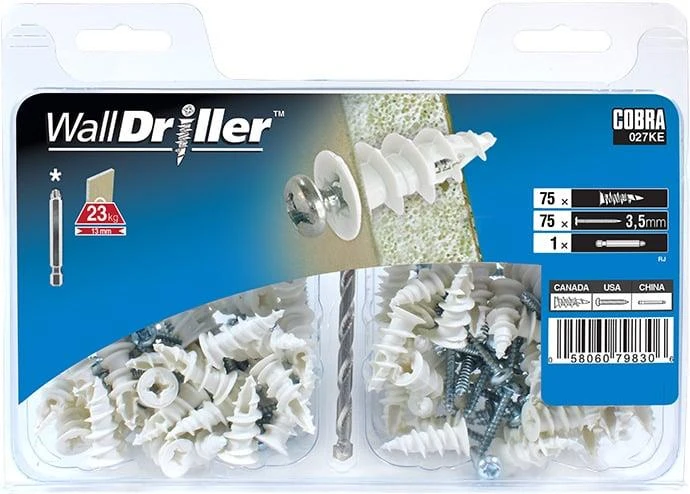 Preču zīmols - Cobra. Skrūvju tips - paredzēts GK plāksnēm. Garums - 22 mm. Diametrs - 3,5 mm. Piestiprināšanas veids - ieskrūvējams. Skrūvju materiāls - nailons. Krāsa - balta. Vienības iepakojumā - 75.