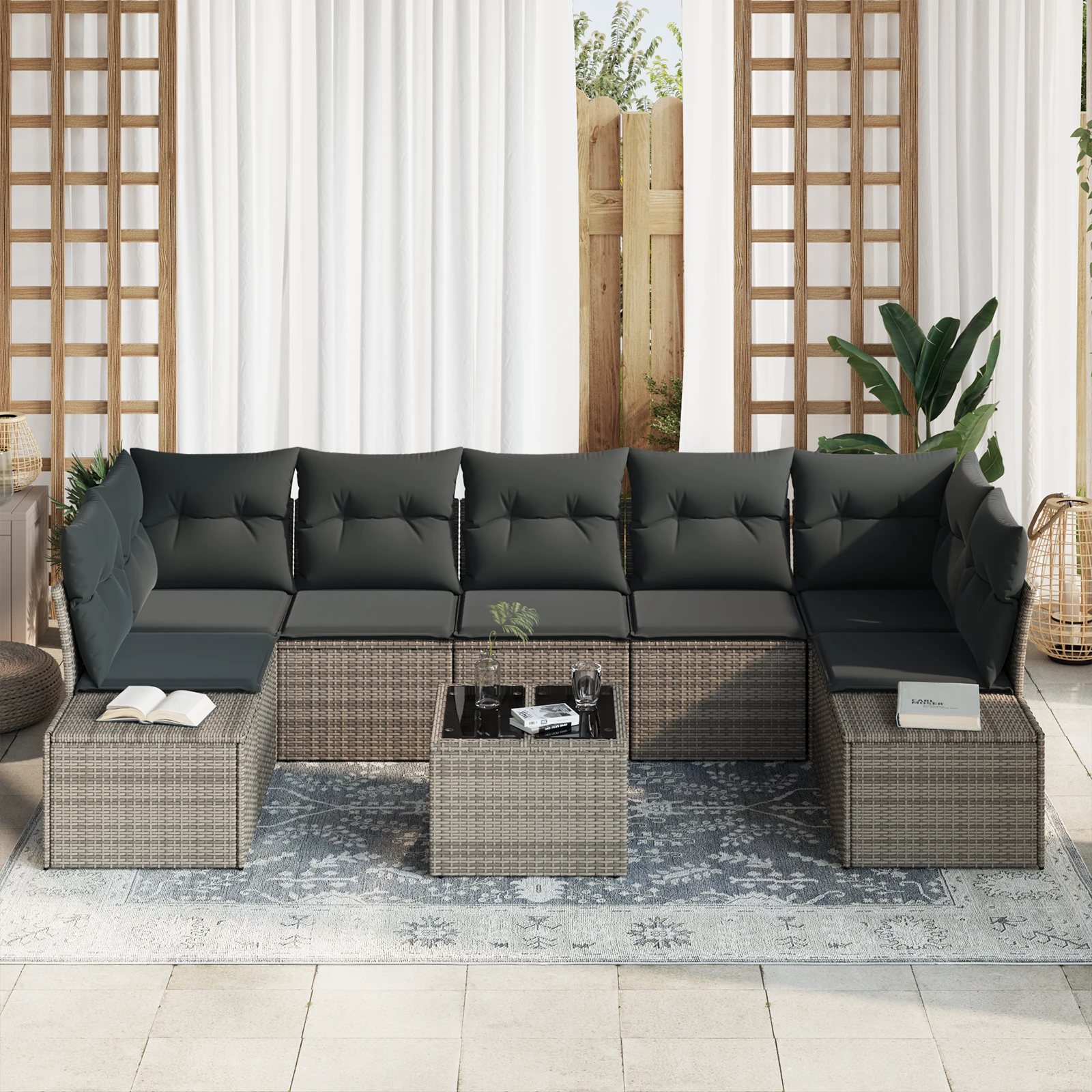- Modulārā konstrukcija: Komplekts ir modulārs, ļaujot to pielāgot dažādiem izkārtojumiem, lai nodrošinātu komfortu. Pārkārtojiet sadaļas, lai pielāgotu sociālām mijiedarbībām vai intīmākām sanāksmēm. Viegli savienojamais mehānisms nodrošina ātru pārvietošanu, piedāvājot daudzveidību dārzā vai terasē.