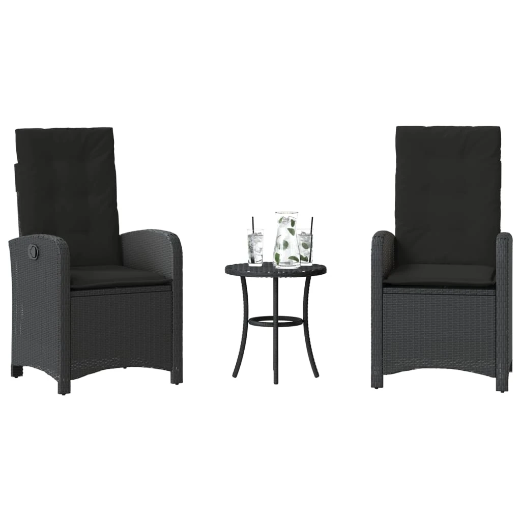 vidaXL 3-daļīgs bistro mēbeļu komplekts, matrači, melna PE rotangpalma
