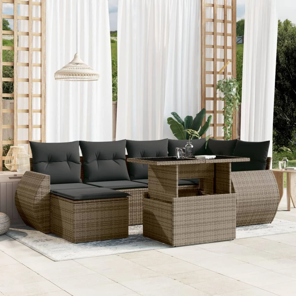 vidaXL 7-daļīgs dārza dīvāna komplekts, matrači, pelēka PE rotangpalma