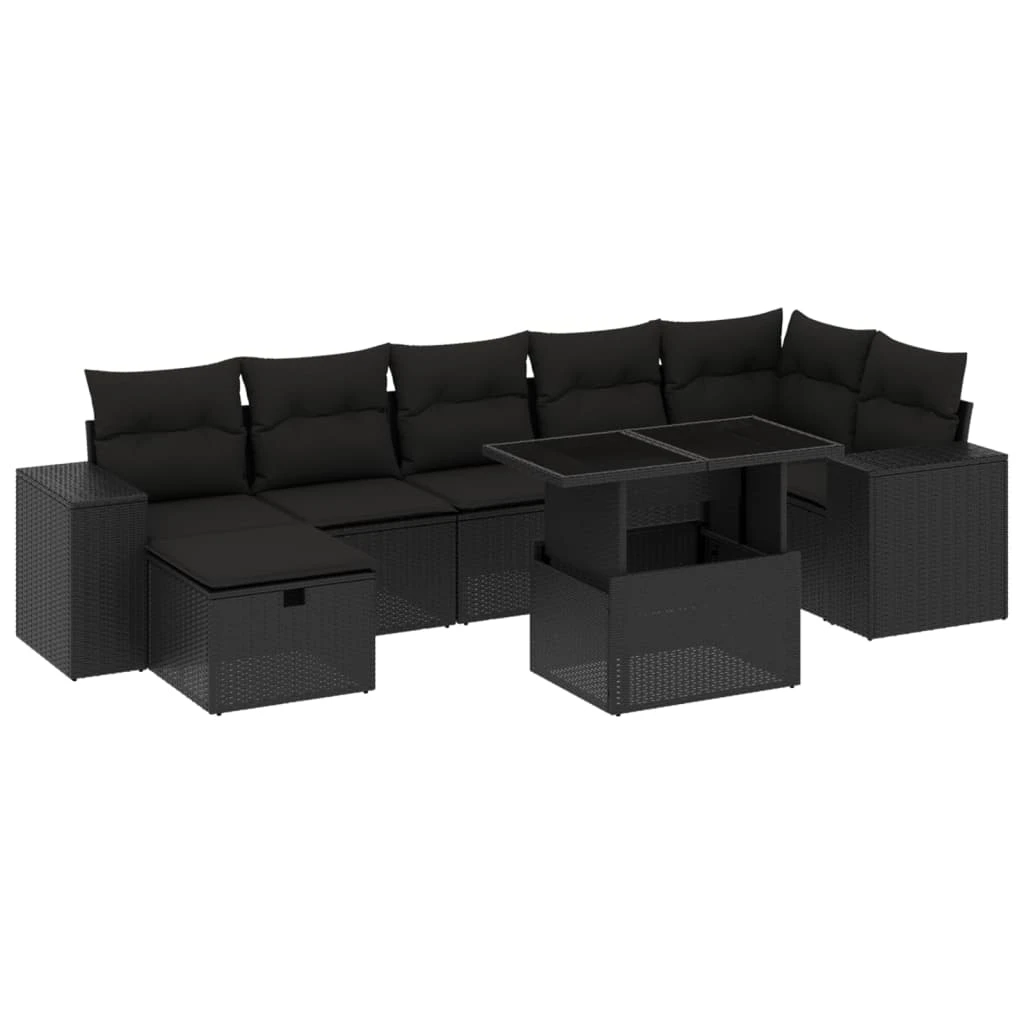 vidaXL 8-daļīgs dārza dīvāna komplekts, matrači, melna PE rotangpalma
