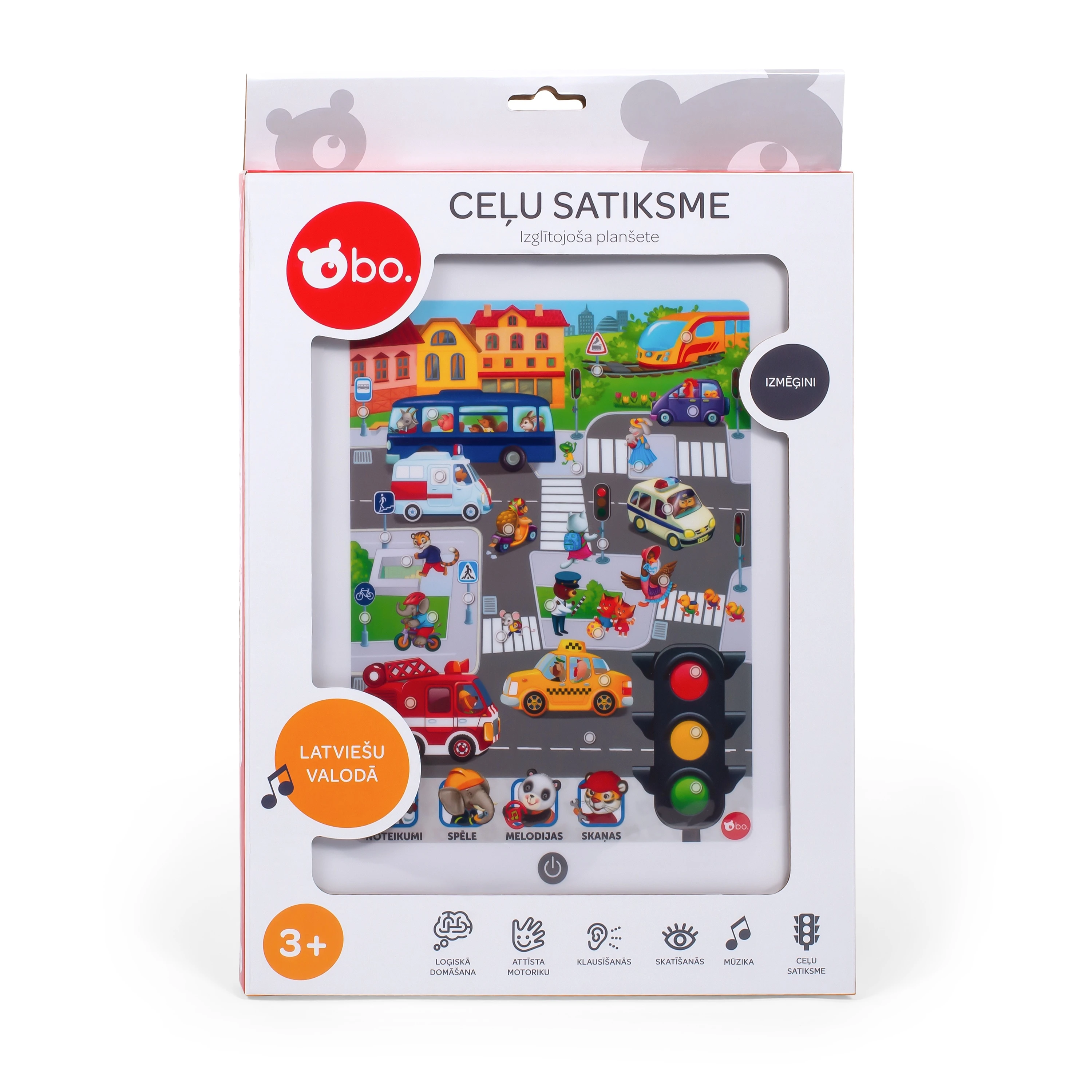 Ir tik viegli un aizraujoši apgūt ceļu satiksmes noteikumus ar jauno, latviski runājošo bo. Satiksmes mācību planšetdators! Klausieties ceļa zīmju un ceļa apzīmējumu nosaukumus, transportlīdzekļu nosaukumus un to skaņās. Atcerieties noteikumus un pārbaudiet savas zināšanas, spēlējot aizraujošu spēli! Jautrās melodijas papildinās izklaidi! Ietver tādas populāras bērnu dziesmas kā "Autobusā", "Luksofors", "Pāri ielai", "Braucu es ar riteni" un "Sprādzējies".