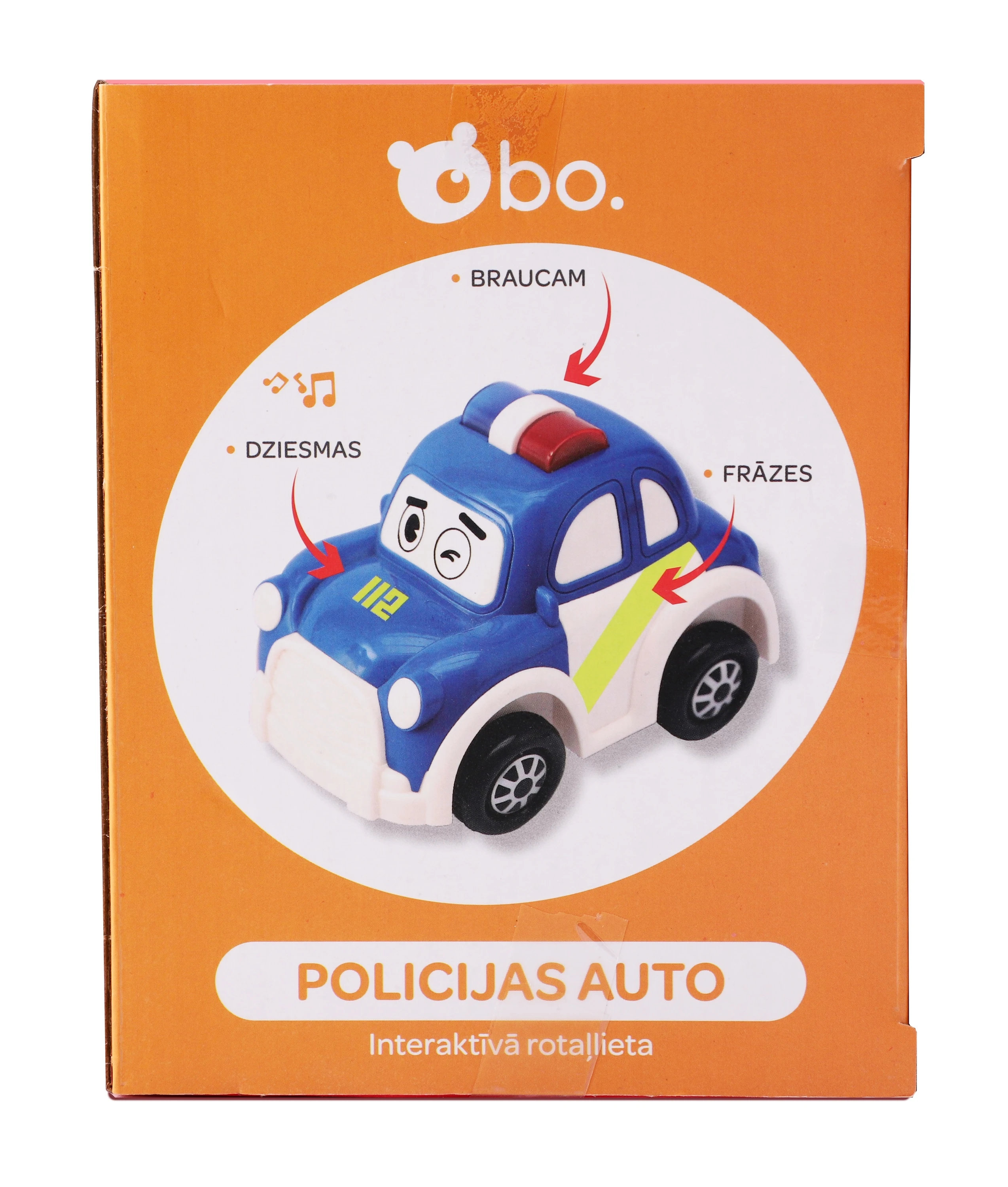 Šis interaktīvais bo. Policijas auto būs lielisks pirmais auto jūsu mazulim! Pateicoties trieciena sensoriem, automašīna turpinās braukt tālāk un tālāk, līdz jūs to apturēsiet. Jautrās skaņas un gaismas efekti padara to aizraujošu mazajiem bērniem. Nospiediet uz durvīm, un automašīna sāks runāt latviski! Nospiediet dzinēja pārsegu, un jūs varēsiet klausīties 4 latviešu dziesmas!