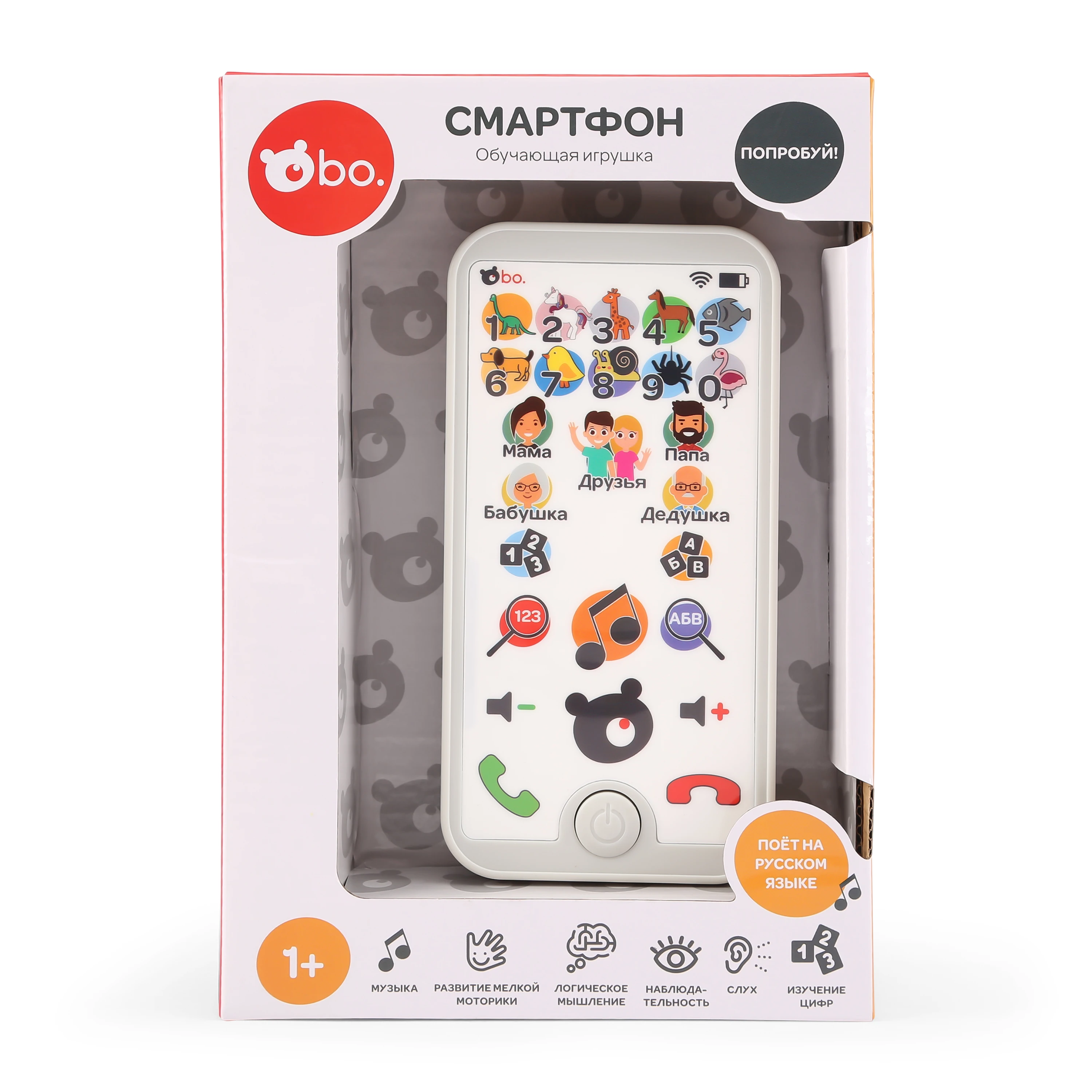 Ar šo jautro bo. Viedtālruni jūsu bērns iemācīsies ciparus un vārdus! Šajā tālrunī ir divas jautras un izglītojošas spēles, kurās jūsu bērnam būs jāatrod cipari vai vārdi! Nospiediet pogu "mūzikas nots", un tālrunis sāks dziedāt dziesmu!