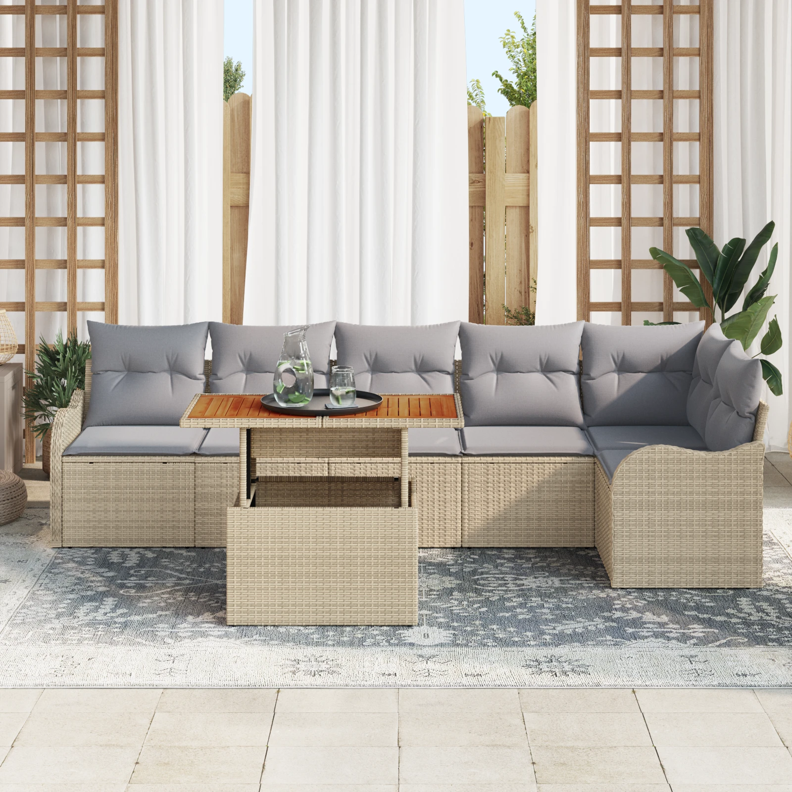 Šis dārza dīvānu komplekts ar spilveniem no polietilēna rotangpalmas ir tieši tas, kas nepieciešams mūsdienīgām āra vietām. Tas viegli apvieno stilu un praktiskumu. Modernais izskats ar vienkāršajām līnijām bez liekiem rotājumiem padara to par stilīgu papildinājumu dārziem, terasēm vai jebkurai āra zonai. Dīvānu komplekts ir ērts, neupurējot izskatu, un audums piešķir nedaudz klases, kam seko dabīgā akācijas koka elementi, radot elegantas un atturīgas sajūtas.