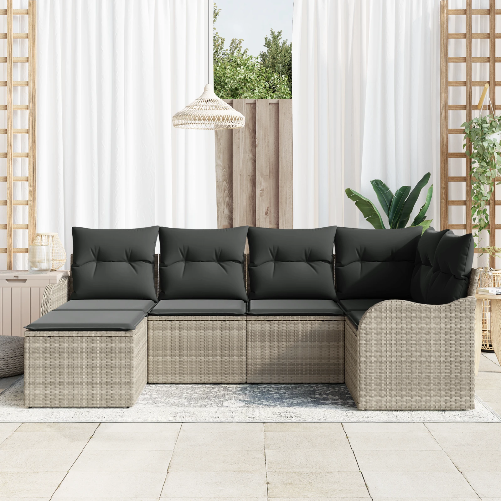 - Iekļautās sastāvdaļas: Āra dīvānu komplekts nāk ar poliestera pildītiem spilveniem, kas ir ērti un izturīgi. Tāpat komplektā ir praktiski uzglabāšanas nodalījumi, kas sniedz iespēju glabāt spilvenus un aksesuārus, saglabājot kārtību.