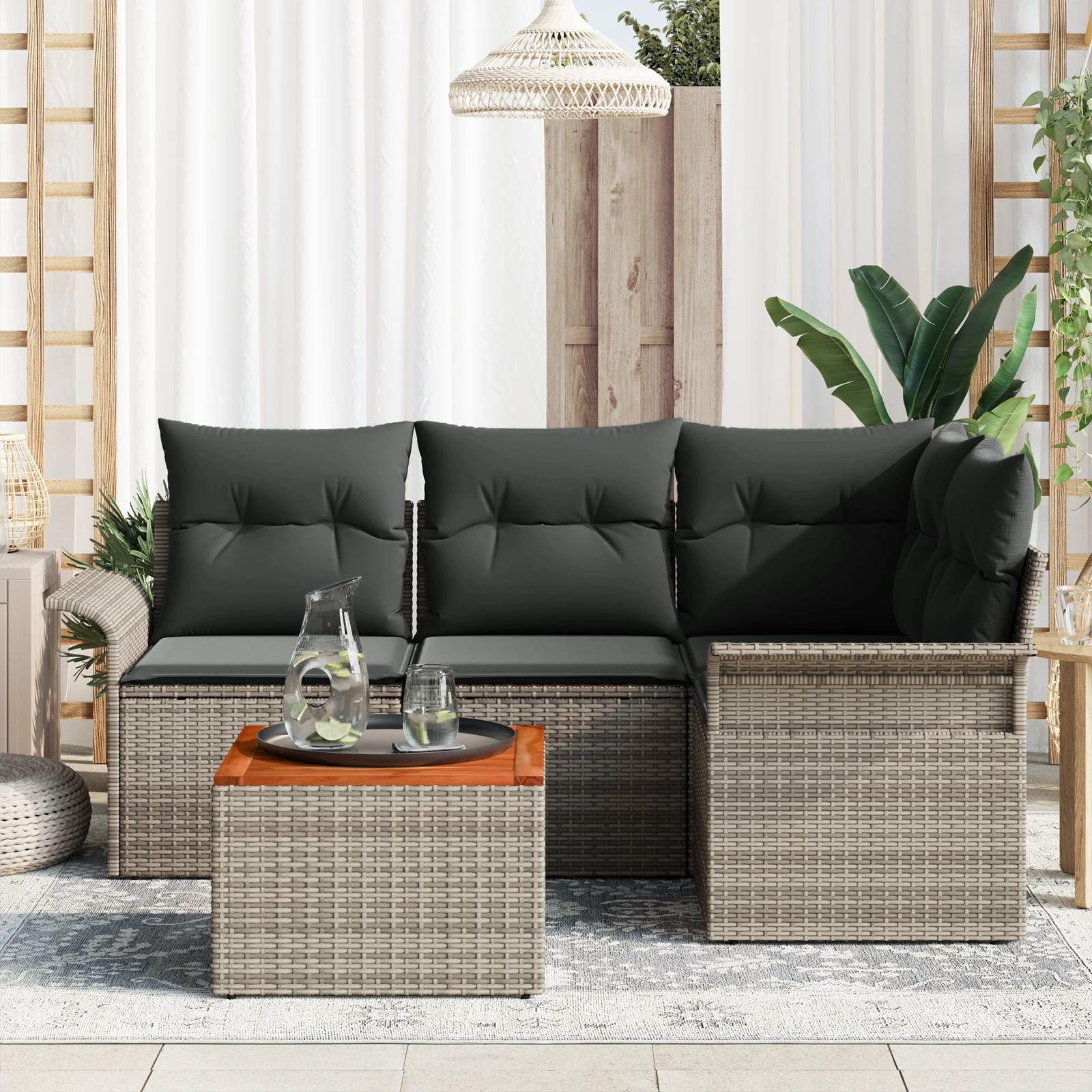 - Materiāli: Komplekts ir izgatavots no polietilēna rotangpalmas, kas nodrošina stilīgu izskatu un izturību pret laikapstākļiem. Masīvkoka akācija piešķir dabīgu eleganci, apvienojoties ar mūsdienīgu rotangpalmas dizainu.