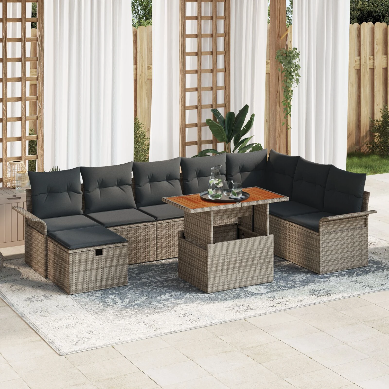 - Funkcijas /Darbība /Dizains Šis komplekts ir izstrādāts, lai izturētu ārējus apstākļus, un UV izturīgie materiāli nodrošina, ka jūsu mēbeles paliek spilgtas vasarā. Uzglabāšanas nodalījumi pievieno ērtību, sniedzot slēptas vietas spilveniem un citiem priekšmetiem, kas uzlabo funkcionalitāti, neapdraudot estētiku.