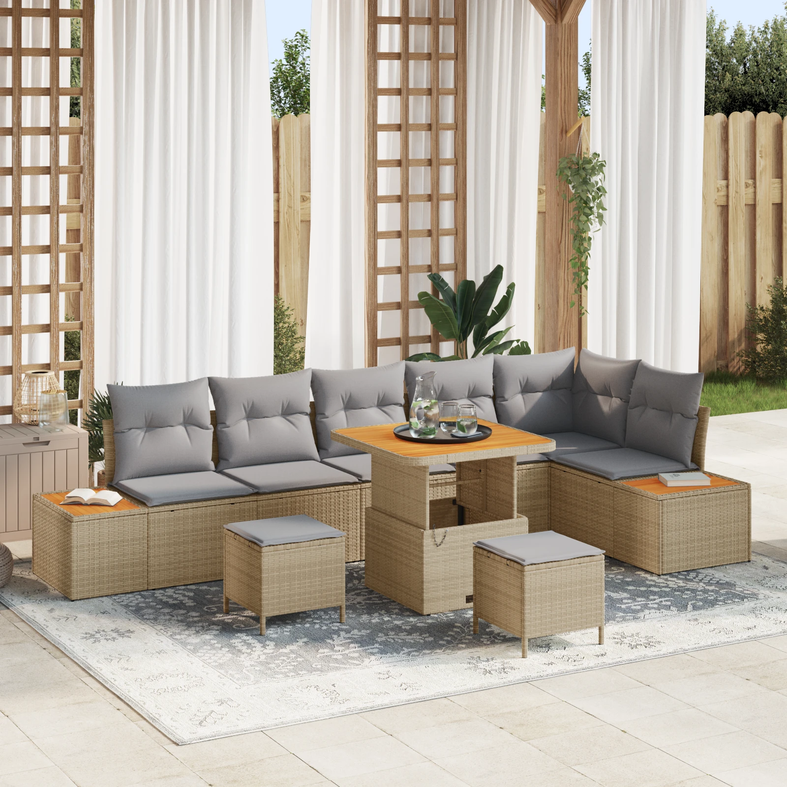 - Moderni materiāli: Dārza dīvānu komplekts ir veidots no izturīgas poliratanas un akācijas koka, kas piešķir modernu izskatu un ir izturīgs pret laikapstākļiem. Poliratanas ļauj radīt stilīgu, austu izskatu ar UV izturību, bet akācijas koks pievērš uzmanību ar savu siltu toņu.