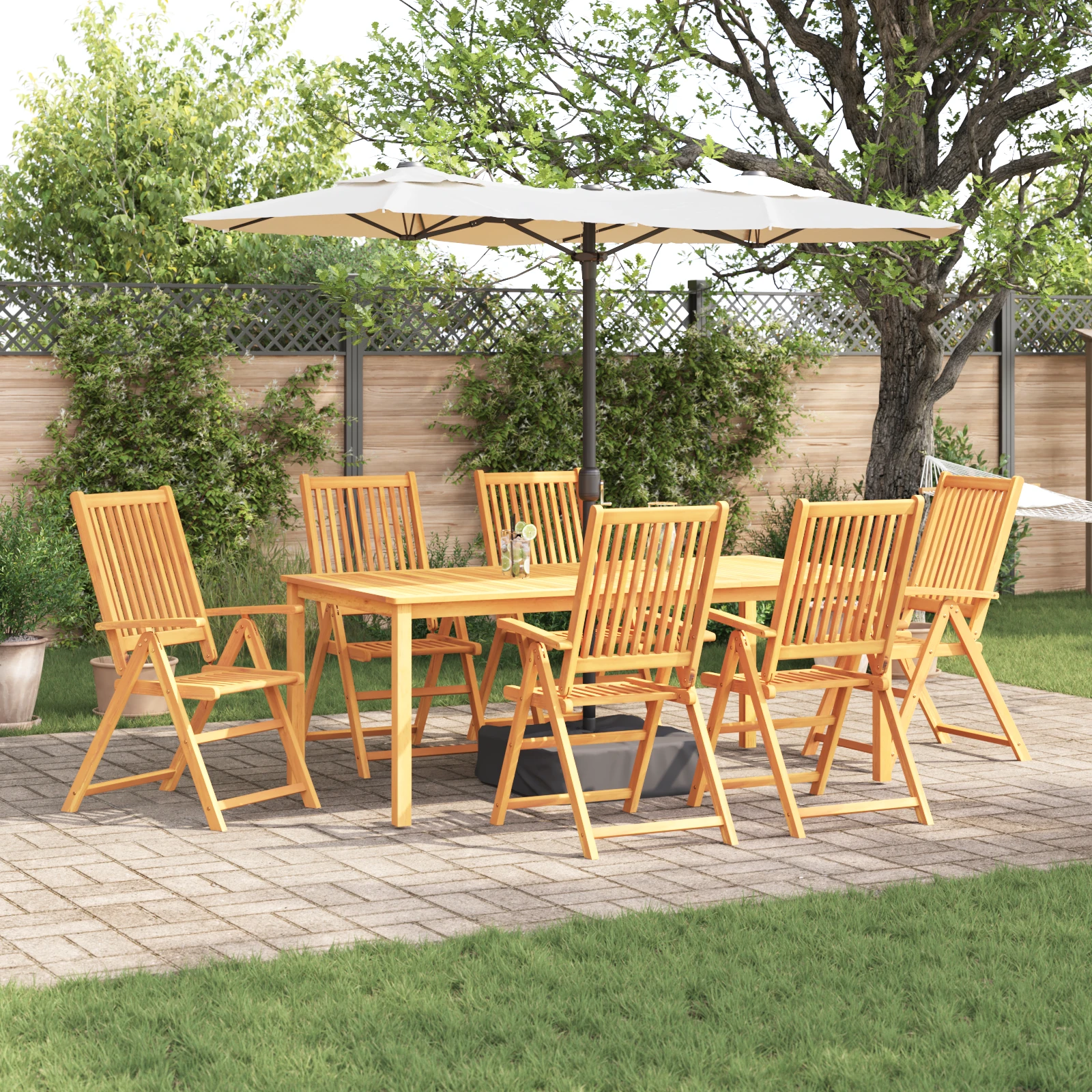 - Akācijas masīvkoks: Detaļas ir izgatavotas no akācijas koka, kas ir pazīstams ar savu izturību un noturību pret laikapstākļiem. Koks ir rūpīgi izvēlēts, lai nodrošinātu stabilitāti un ilgtspēju āra lietošanai, garantējot, ka komplekts izskatās labi visu gadu.