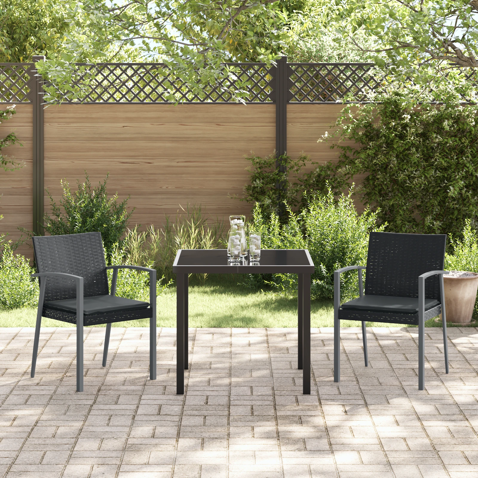 Šis mūsdienīgais dārza galds piedāvā stilīgu un praktisku risinājumu. Izstrādāts tieši āra pasākumiem, tas būs ideāls pavasara un vasaras satikšanās brīžiem dārzā vai terasē. Elegantais melnā tērauda rāmis un apdare piešķir galdam kvalitatīvu izskatu, kas lieliski iederas ārā. Materiāli, kas pasargā no UV stariem, nodrošina, ka šis komplekts var izturēt laika apstākļus, kļūstot par uzticamu izvēli āra maltītēm. Patīkamā PE rotangpalma nodrošina komfortu un eleganci, aicinot uz ilgām vakariņām zem saules vai zvaigžņu debesīm.