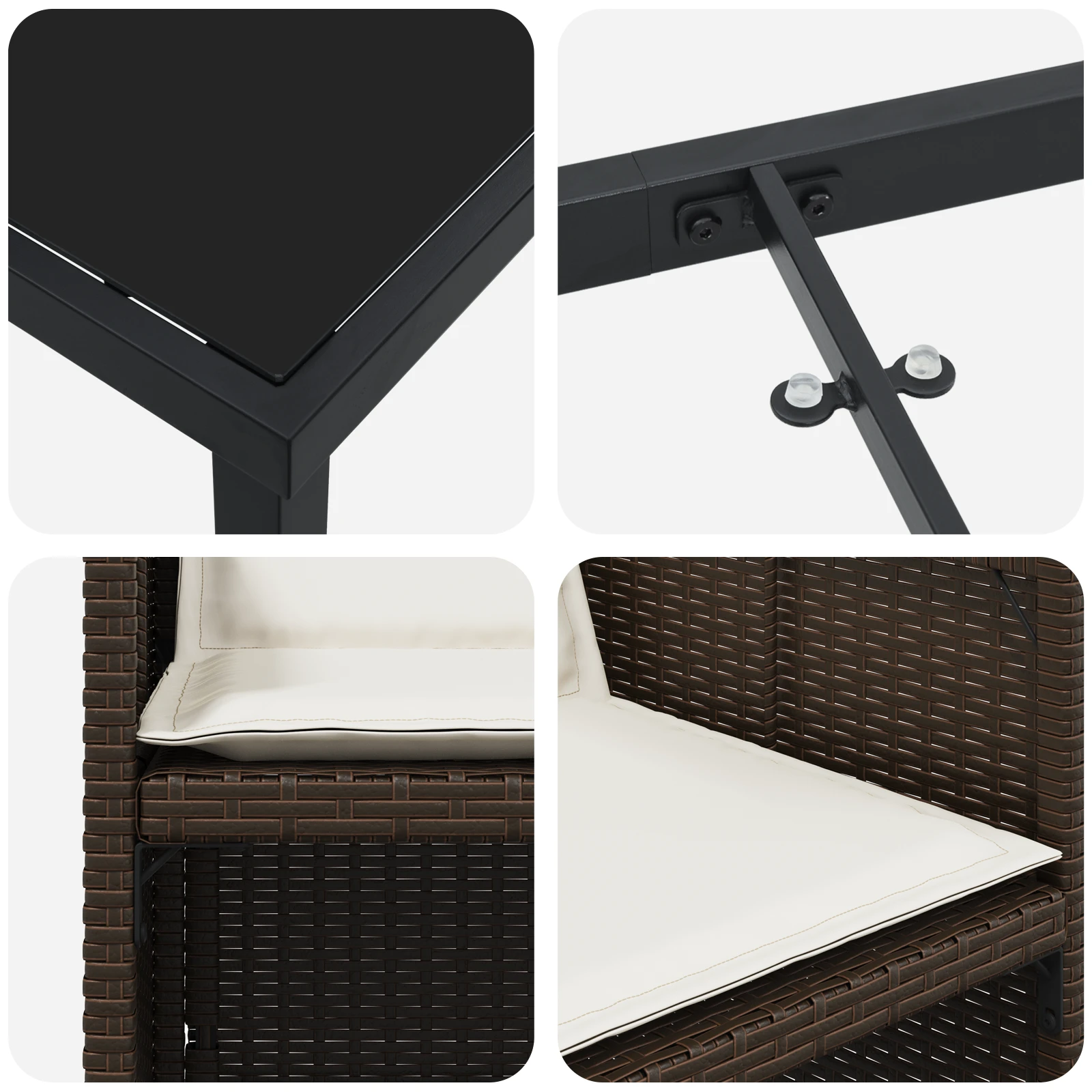 - Materiāli: Izgatavots no polietilēna rotangpalmas, šo komplektu var droši izmantot ārā, pateicoties tā izturībai. Rūdīta stikla virsma ir eleganta un ērti kopjama, saglabājot stilu, vienlaikus ir praktiska. Pulverkrāsotā tērauda rāmis nodrošina stabilu un izturīgu struktūru, kas iztur jebkādus laika apstākļus.