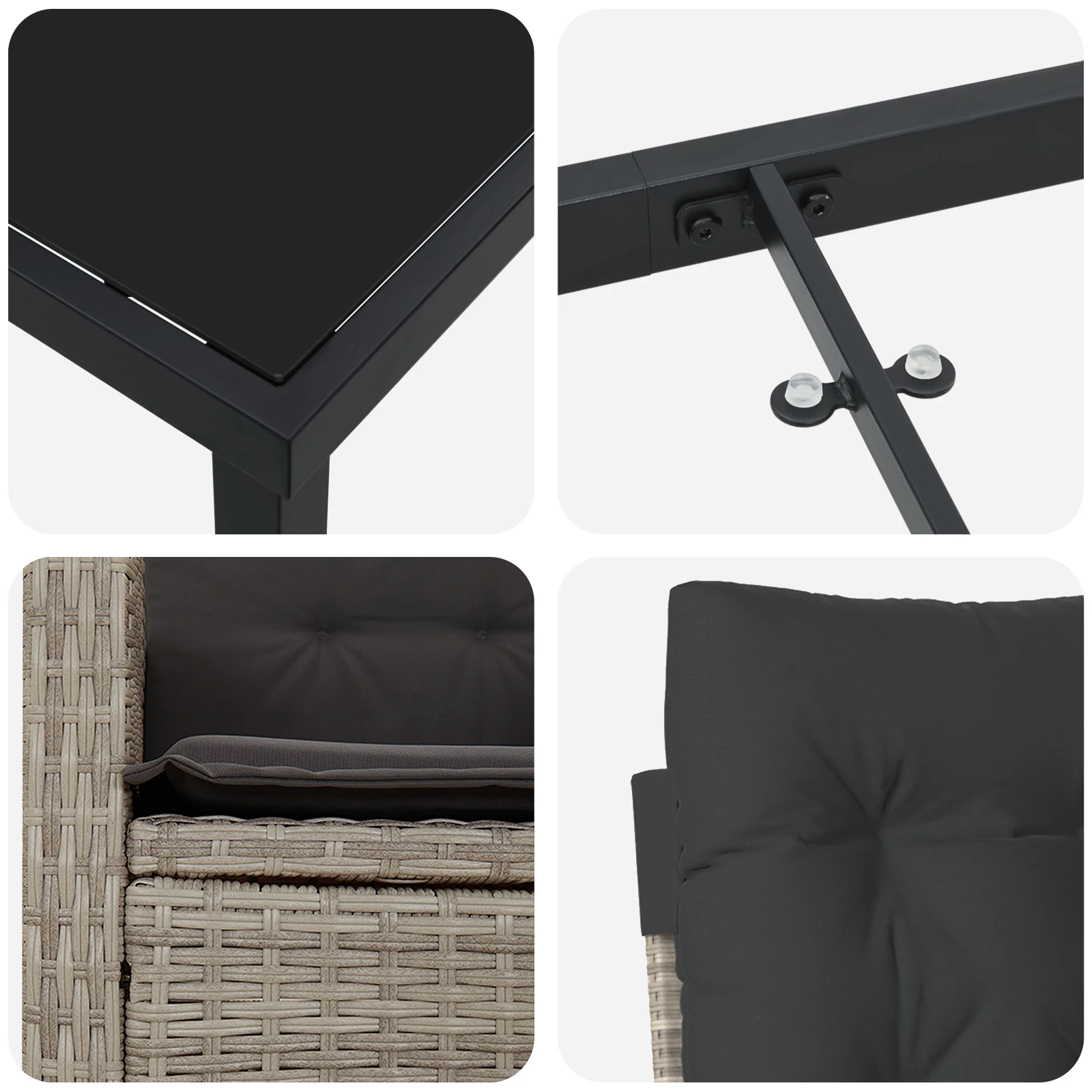 - Materiāli: Šis galds izgatavots no poliratanas un stipra tērauda, tādējādi nodrošinot ilgstošu un stilīgu lietošanu. Poliratanas materiāls nodrošina aizsardzību pret UV stariem un laikapstākļiem, kamēr tērauda rāmis sniedz stabilitāti.