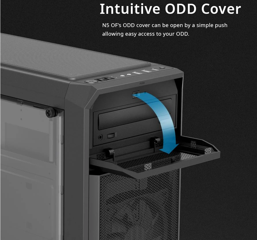 I/O porti: 1 x austiņas, 1 x mikrofons, 2 x USB 2.0, 1 x USB 3.0, barošanas poga, atiestatīšanas poga, ventilatora LED kontrolieris (mainiet ventilatora ātrumu un LED spilgtumu)