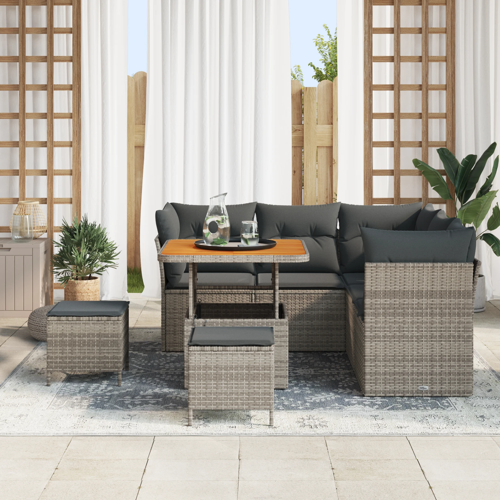 - Izturīgi materiāli: Augstas kvalitātes poli-rotangs un akācijas koks ļoti labi iztur āra apstākļus, paliekot stilīgiem pat pēc vairākiem gadiem.