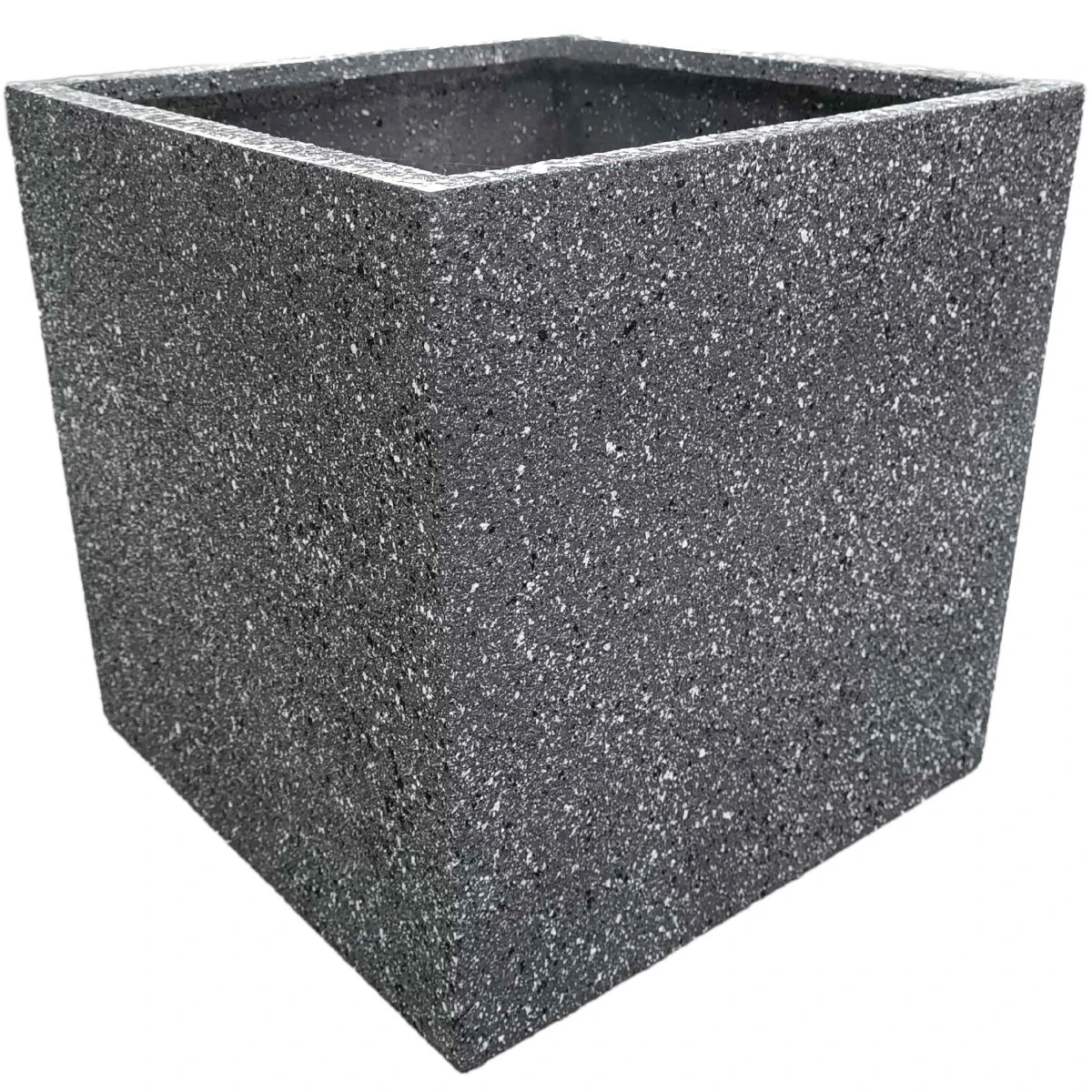 Tumši pelēks kubisks puķu pods izgatavots no stikla šķiedras, kas ir ļoti izturīgs materiāls. Tas ir izturīgs pret mehāniskiem bojājumiem, laikapstākļiem un UV stariem. Izmērs (G x P x A) 40 x 40 x 40 cm.