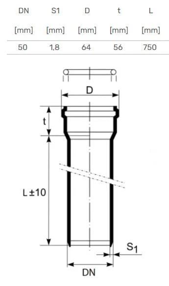 Zīmols- Magnaplast. Diametrs- 50 mm. Santehniskais savienojums. diametrs- 50 mm – Gluds gals. 50 mm – Uzmavas gals. Sieniņas biezums- 1.8 mm. Garums- 0.75 m. Trokšņa līmenis- 26 dB. Materiāls- Polipropilēns (PP). Maksimālā pastāvīgo notekūdeņu temperatūra- 90 °C. Krāsa- Pelēka krās.. Papildus informācija- Materiāls: Polipropilēns. Diametrs: 50 mm. Krāsa: Pelēka. Paredzētas lietošanai- Iekštelpu kanalizācijai.