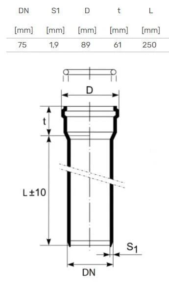 Zīmols- Magnaplast. Diametrs- 75 mm. Santehniskais savienojums. diametrs- 75 mm – Uzmavas gals. 75 mm – Gluds gals. Sieniņas biezums- 1.9 mm. Garums- 0.25 m. Trokšņa līmenis- 26 dB. Materiāls- Polipropilēns (PP). Maksimālā pastāvīgo notekūdeņu temperatūra- 90 °C. Krāsa- Pelēka. Paredzētas lietošanai- Iekštelpu kanalizācijai.