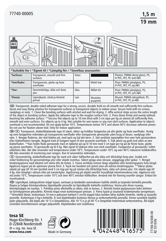 Preču zīmols- Tesa. Modelis- -. Garums- 150 cm. Platums- 1.9 cm. Krāsa- Caurspīdīga. Materiāls- Kaučuks. Piestiprināšanas veids- Pie sienas. Obligātā garantija- 24 mēn.