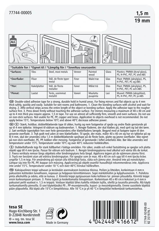 Zīmols- Tesa. Modelis- -. Garums- 150 cm. Platums- 1.9 cm. Krāsa- Balta. Materiāls- Politelēns (PE). Stiprinājuma veids- Pie sienas. Obligātā garantija- 24 mēn.