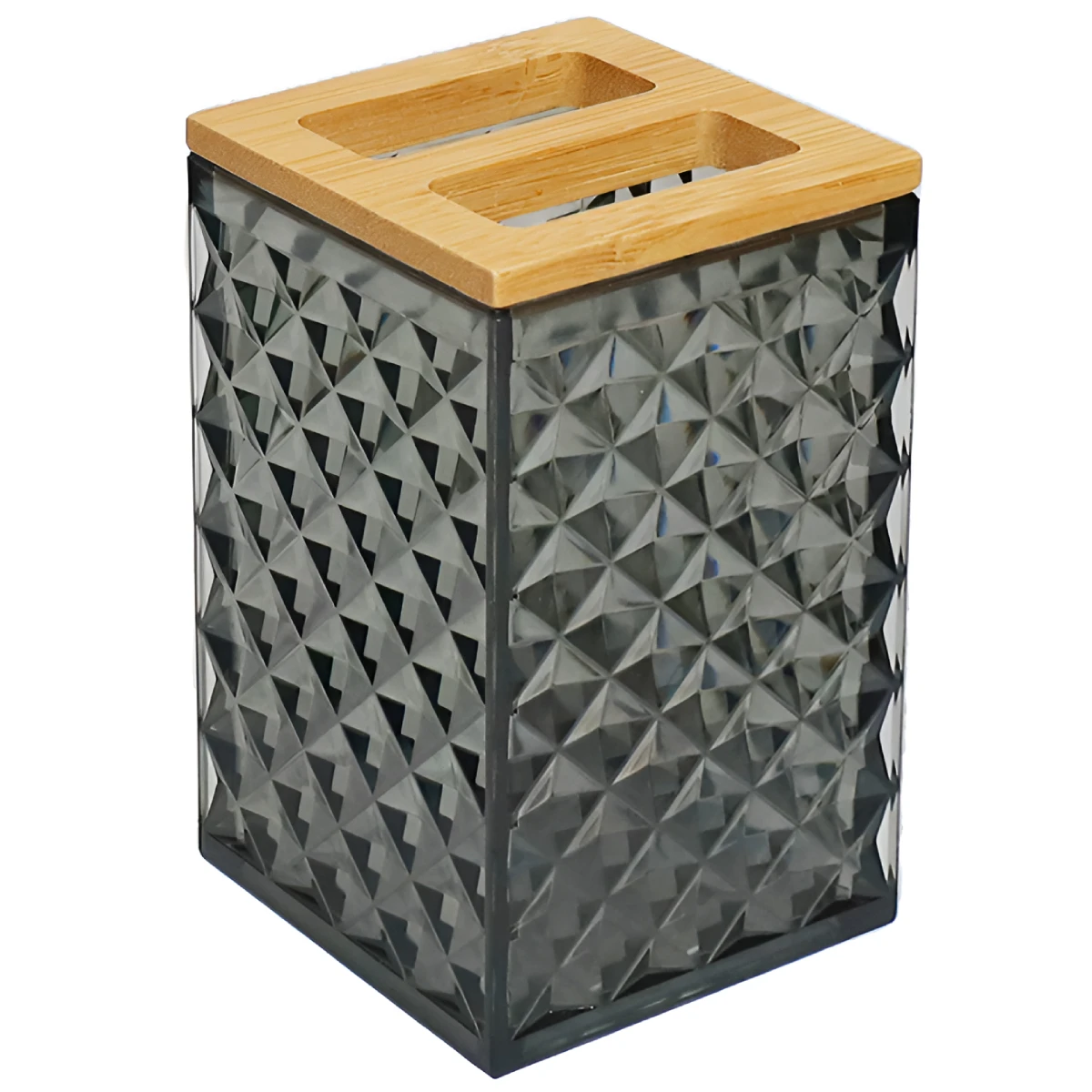 Universālā Diamond glāze ir elegants un praktisks vannas istabas aksesuārs. Izgatavota no izturīga plastmasas materiāla ar pievilcīgu dimanta rakstu pelēkā krāsā, tā lieliski iekļausies jebkurā vannas istabas interjerā. Glāzes augšdaļu rotā dabīgs bambusa vāciņš ar divām atverēm, kas nodrošina ērtu zobu birstes, kosmētikas otiņu un citu piederumu novietošanu un higiēnisku uzglabāšanu. Šis daudzpusīgais aksesuārs ir ne tikai funkcionāls, bet arī pievieno modernu akcentu jūsu vannas istabas dizainam.