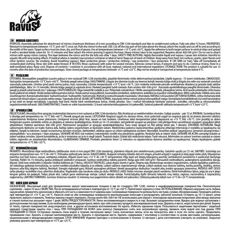 Zīmols- Ravus. Līmes veids- Spoguļiem. Līmes krāsa- Dzeltena. Tilpums- 0.3 l. Patēriņš. g/m ²- 300 - 600. Pilnīgi sausa pēc- 72 - 72h. Papildus informācija- Pilnīgi sausa pēc: 72 - 72h.
