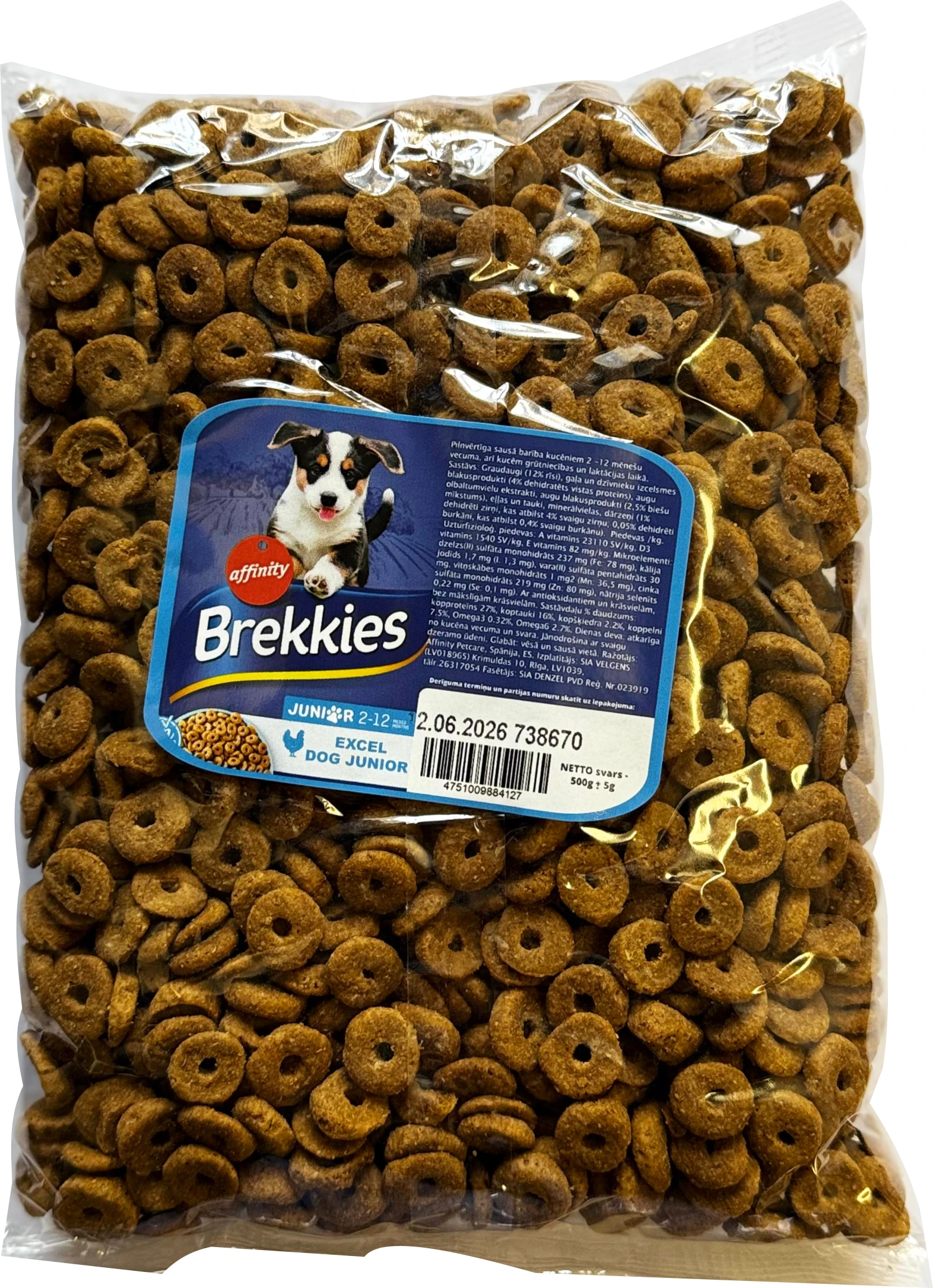 BREKKIES DOG JUNIOR pilnvērtīga sausā barība kucēniem 2-12 mēn., ar vistas gaļu, dārzeņiem un graudaugiem. Pirmajā dzīves gadā jūsu kucēnam ir nepieciešams Brekkies Junior, kas, pateicoties vitamīniem, minerālvielām un olbaltumvielām, palīdz kucēna augšanai un attīstībai. SASTĀVS: Graudaugi (12% rīsi), gaļa un dzīvnieku izcelsmes blakusprodukti (4% dehidratēta vistas proteīna), augu olbaltumvielu ekstrakti, augu blakusprodukti (2,5% biešu mīkstums), eļļas un tauki, minerālvielas, dārzeņi (1% dehidrēti zirņi, ekvivalents 4% svaigiem zirņiem; 0,05% dehidrētie burkāni, ekvivalents 0,4% svaigiem burkāniem).