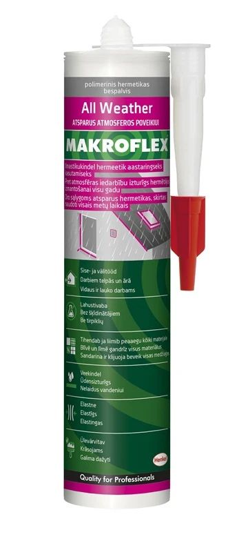 Zīmols- Makroflex. Kolekcija- All Weather. Krāsa- Caurspīdīga. Mērķis- HERMĒTIĶIS MF ALL WEATHER BEZKRĀS280ML. Tilpums- 0.28 l. Temperatūras izturība- -40 - +80°C. Izturīgs pret mitrumu- Jā. Izturīgs pret pelējumu- Jā. Lietošanas nosacījumi- Sausās telpās. Mitrās telpās. Ārā. Iekšējās telpas. Metāla apsmidzināšanai- Jā.