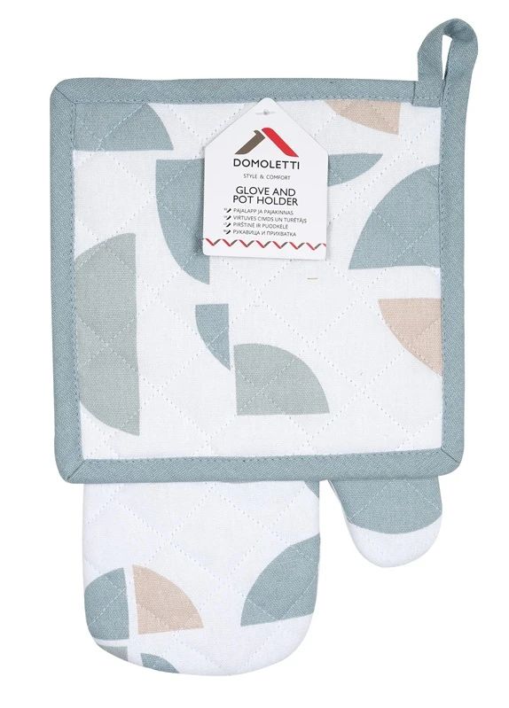 Preču zīmols- Domoletti. Artikuls- PMM/G14086C. Garums- 18 cm. Platums- 31 cm. Krāsa- Balta. Auduma sastāvs- 100 % kokvilna. Papildu informācija- Komplektā: 1 gab. puodkēle: 20 x 20 cm. 1 gab. pirštine: 18 x 31 cm.