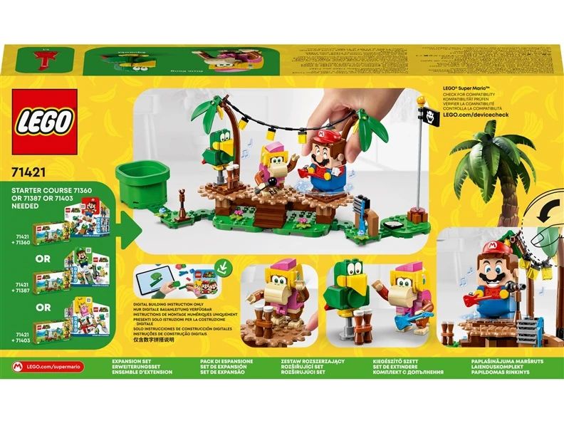 Produkta veids- Konstruktori. Zīmols- LEGO®. Artikuls- 71421. Kolekcija- Super Mario. Materiāls- Plastmasa. Modelis- Dixie Kong's Jungle Jam Expansion Set. Brīdinājums par rotaļlietām- Nav piemērots bērniem, kas jaunāki par trim gadiem., Noņemt visus iepakojuma pielikumus, pirms nododot šo rotaļlietu bērnam. Uz iepakojuma esošo informāciju ieteicams saglabāt. Ieteicams lietot pieaugušo uzraudzībā. Var saturēt nelielas, asas detaļas ar ko bērns var aizrīties vai savainoties.. Ieteicamais vecums no- 7. g..