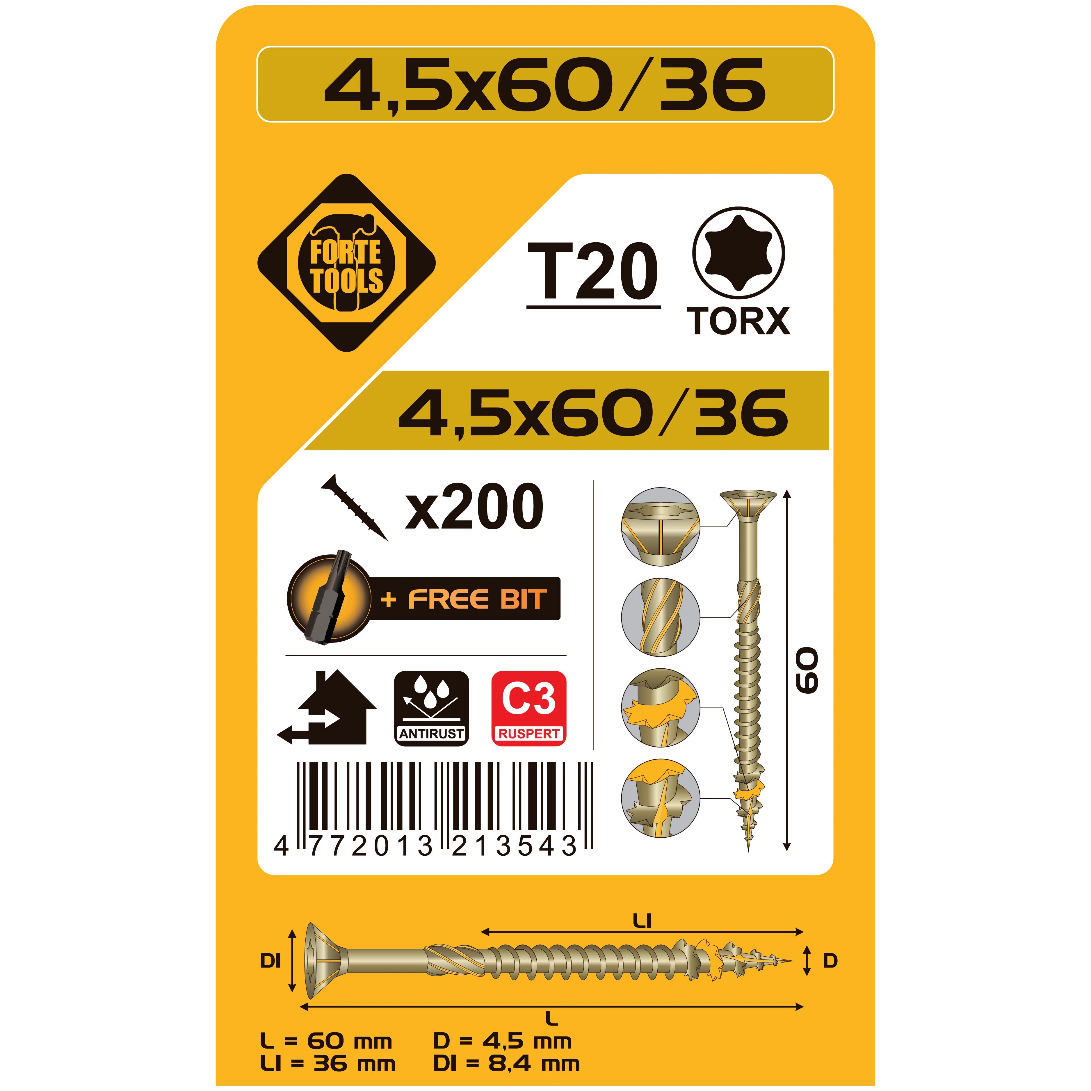 Zīmols- Forte Tools. Skrūves tips- Skrūves kokam. Galvas tips- Padziļinājumā. Pārklājums- Ruspert. Krāsa- Dzeltena. Garums- 60 mm. Diametrs- 4.5 mm. Galvas formas tips- Torx. Vienību skaits iepakojumā- 200.