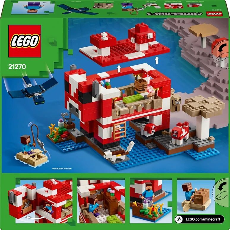 Produkta veids- Konstruktori. Zīmols- LEGO®. Artikuls- 21270. Kolekcija- Minecraft. Materiāls- Plastmasa. Modelis- The Mooshroom House. Brīdinājums par rotaļlietām- Satur sīkas detaļas. Aizrīšanās bīstamība!. Ieteicamais vecums no- 8. g..