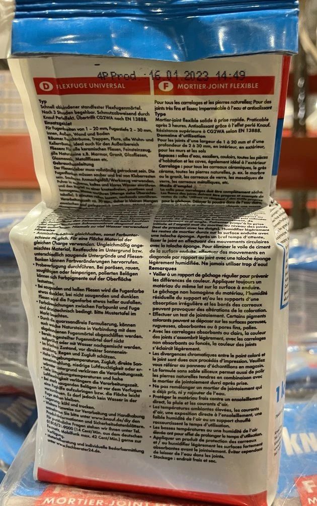 Zīmols- Knauf. Modelis- FLEXFUGE. Maisījuma tips- Dekoratīvs. Vielas/maisījuma pielietojums- Flīžu spraugu šuvošanai. Produkta svars ar iepakojumu- 1 kg. Maisījuma un ūdens attiecība- Sajaukšanas attiecība, uz 1 kg: 0,27 l – 0,29 l ūdens (siena, grīda) Sajaukšanas attiecība, uz 5 kg: 1,35 l – 1,45 l ūdens (siena, grīda). Patēriņš- Flīžu formāts Šuves platums/ dziļums Patēriņš 2 x 2 cm 2 mm x 2 mm 0,62 kg/m2 10 x 10 cm 3 mm x 8 mm 0,80 kg/m2 20 x 20 cm 5 mm x 10 mm 0,82 kg/m² 30 x 30 cm 2 mm x 10 mm 0,23 kg/m2 30 x 60 cm 2 mm x 10 mm 0,17 kg/m2. Darba temperatūra- 5 - 25°C. Maisījuma sastāvs- Materiāla bāze: Sausā java, kas izgatavota no portlandcementa, alumīnija cementa, pulverveida kaļķakmens, plastmasas piedevām, oksīda pigmenti .